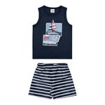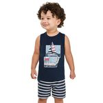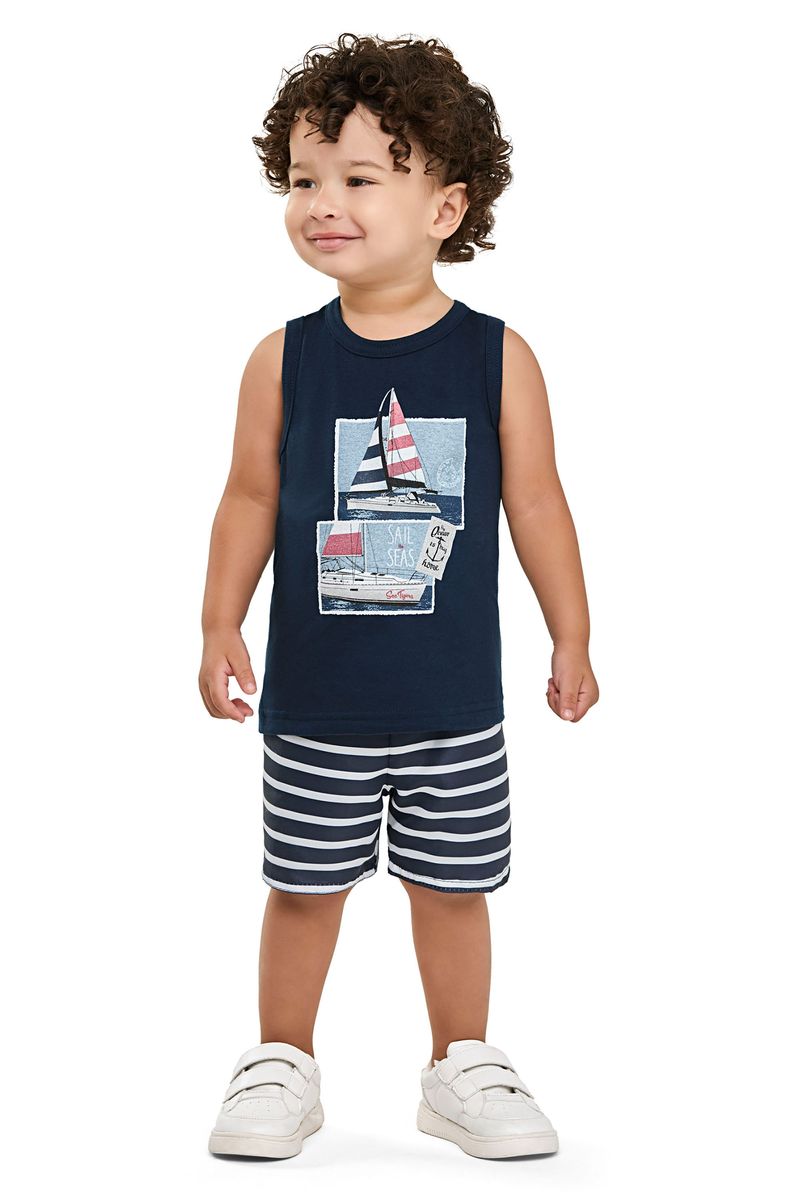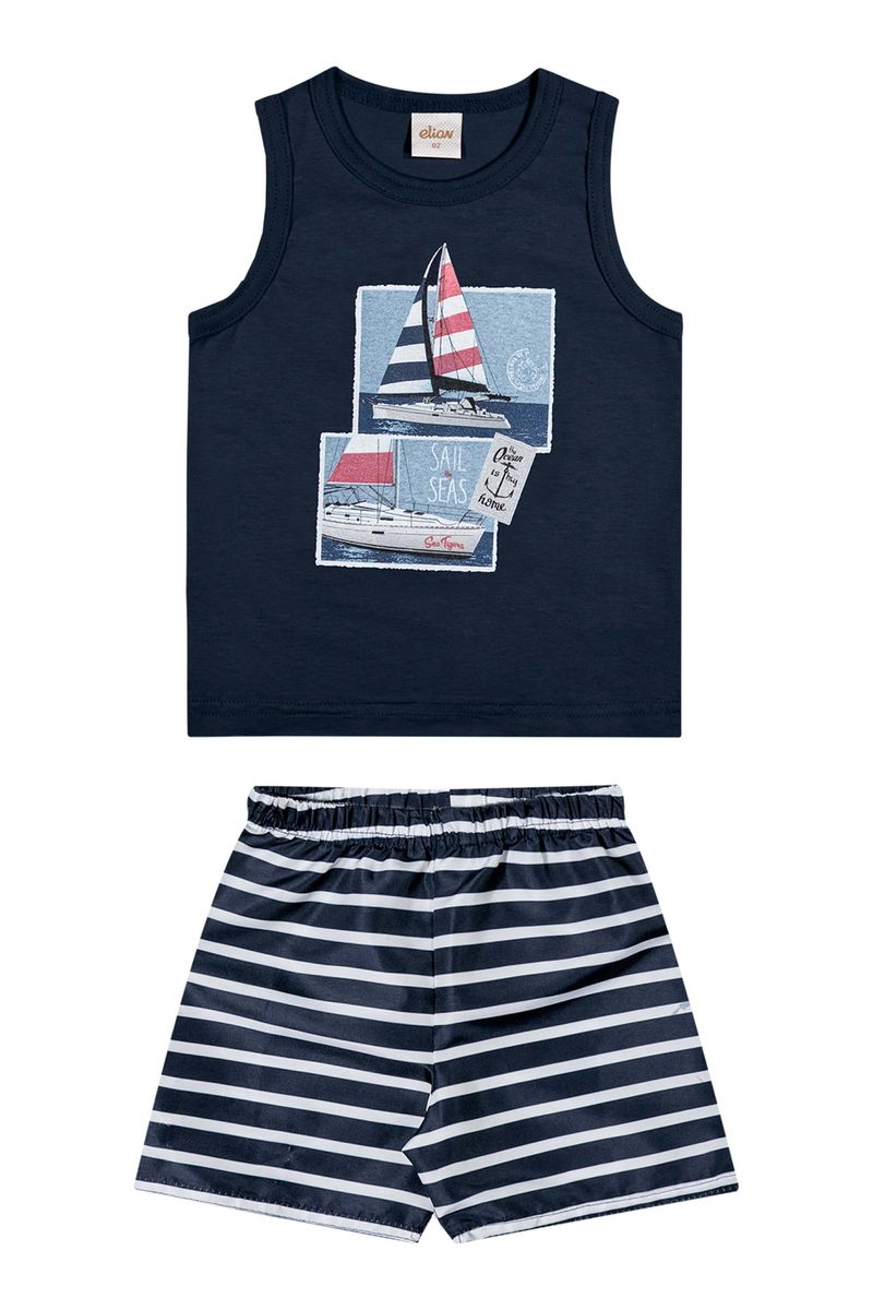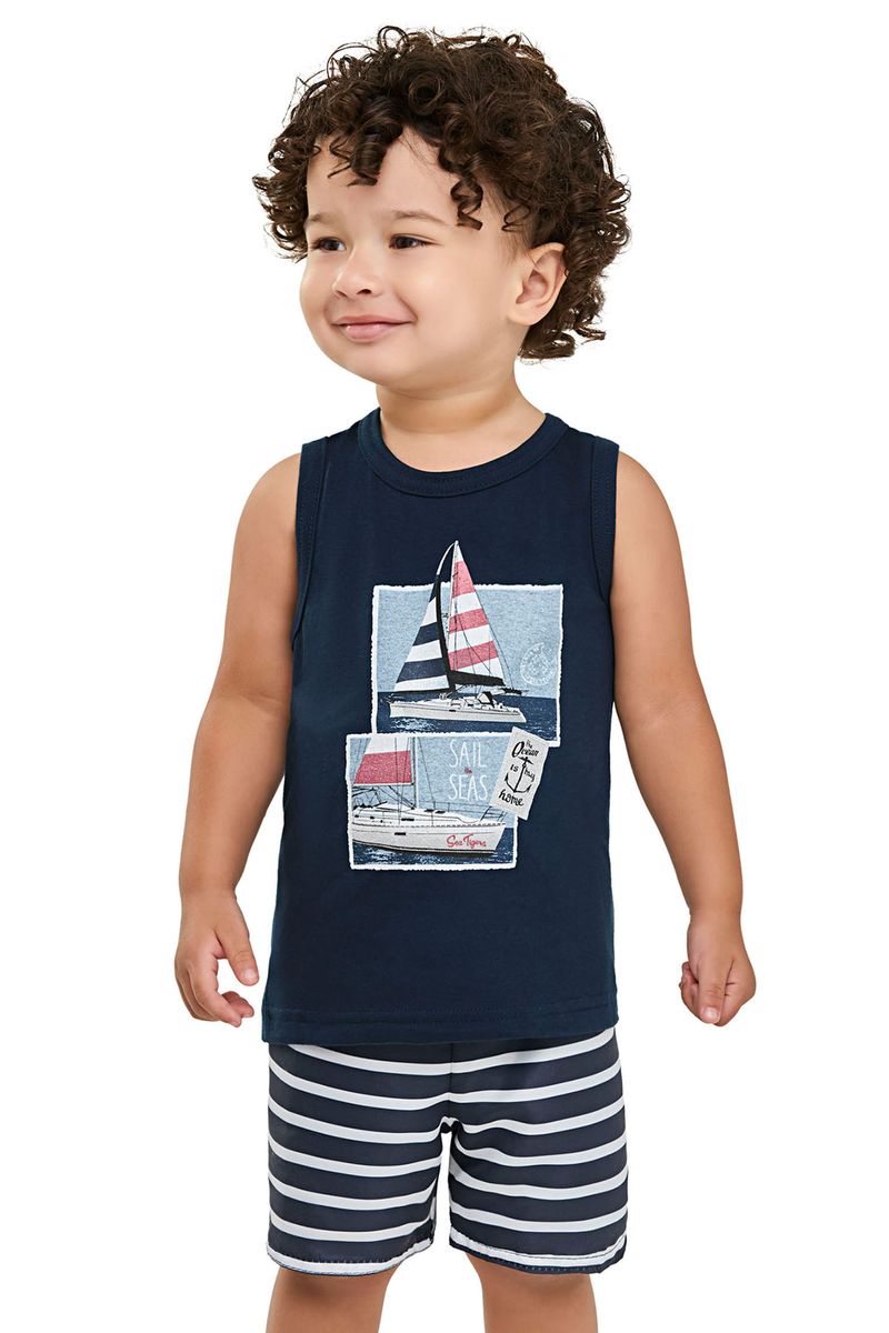 • Conjunto composto por regata e bermuda • Feito em meia malha e tactel com elastano • Estampa de veleiros • Elástico no cós • Ideal para momentos de diversão e dias de sol