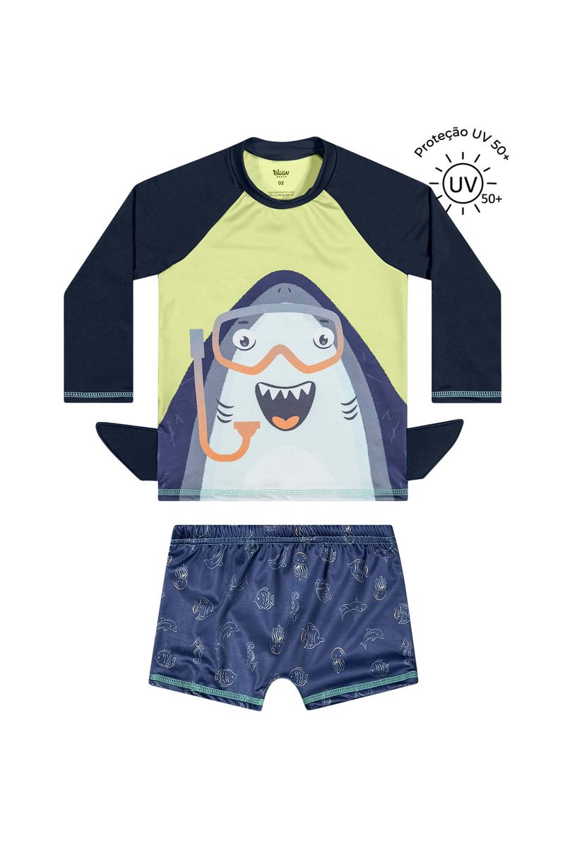 • Conjunto de praia composto por camiseta e sunga • Feito em malha de proteção UV +50 • Mangas longas raglan • Estampa com aplique interativo • Elástico no cós com cadarço interno • Possui forro • Ideal para a praia e piscina