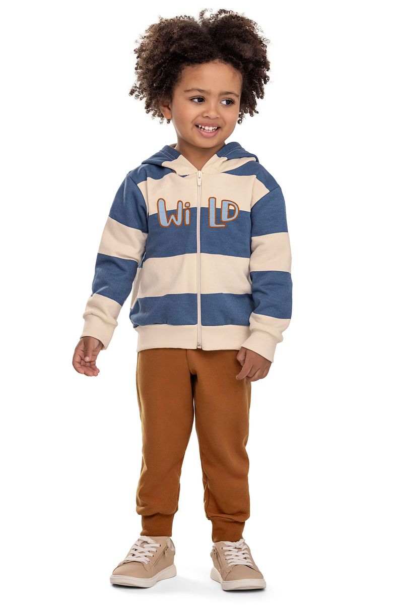 • Conjunto composto por jaqueta e calça • Feito em moletom felpado • Possui mangas longas • Possui capuz • Abertura em zíper • Estampa listrada com bordado • Elástico no cós • Ideal para passeios e momentos de lazer