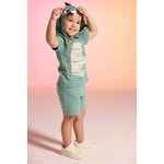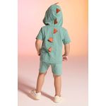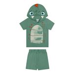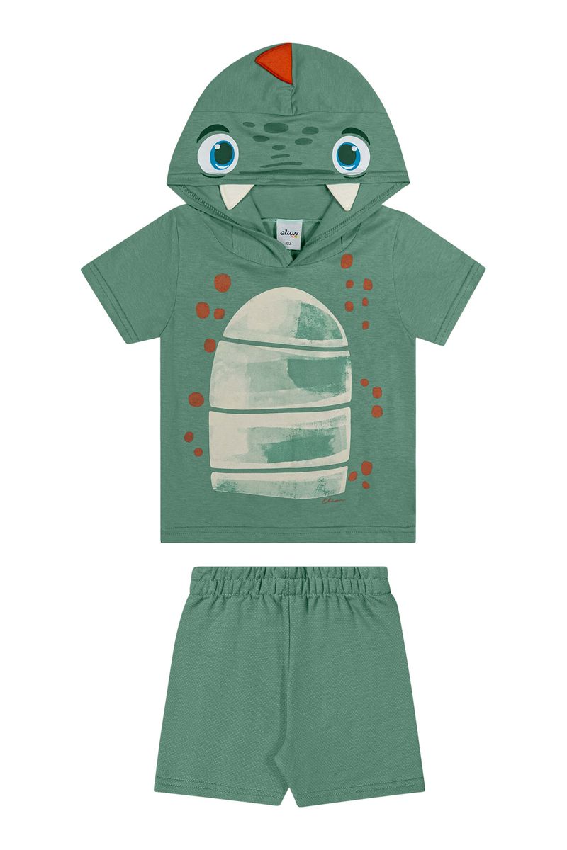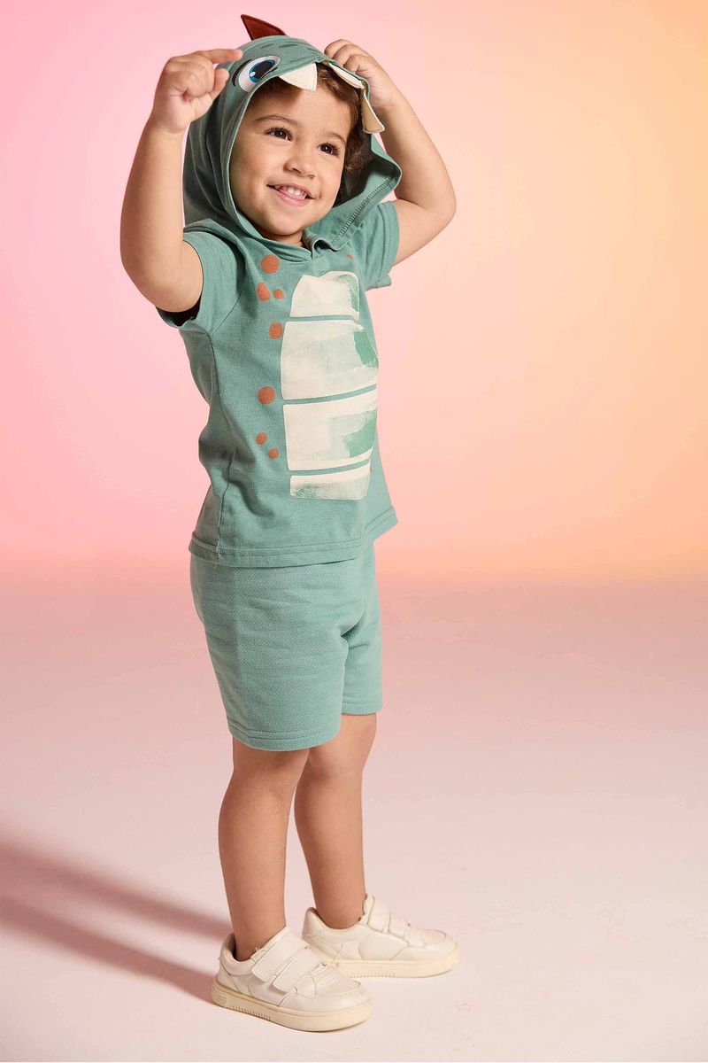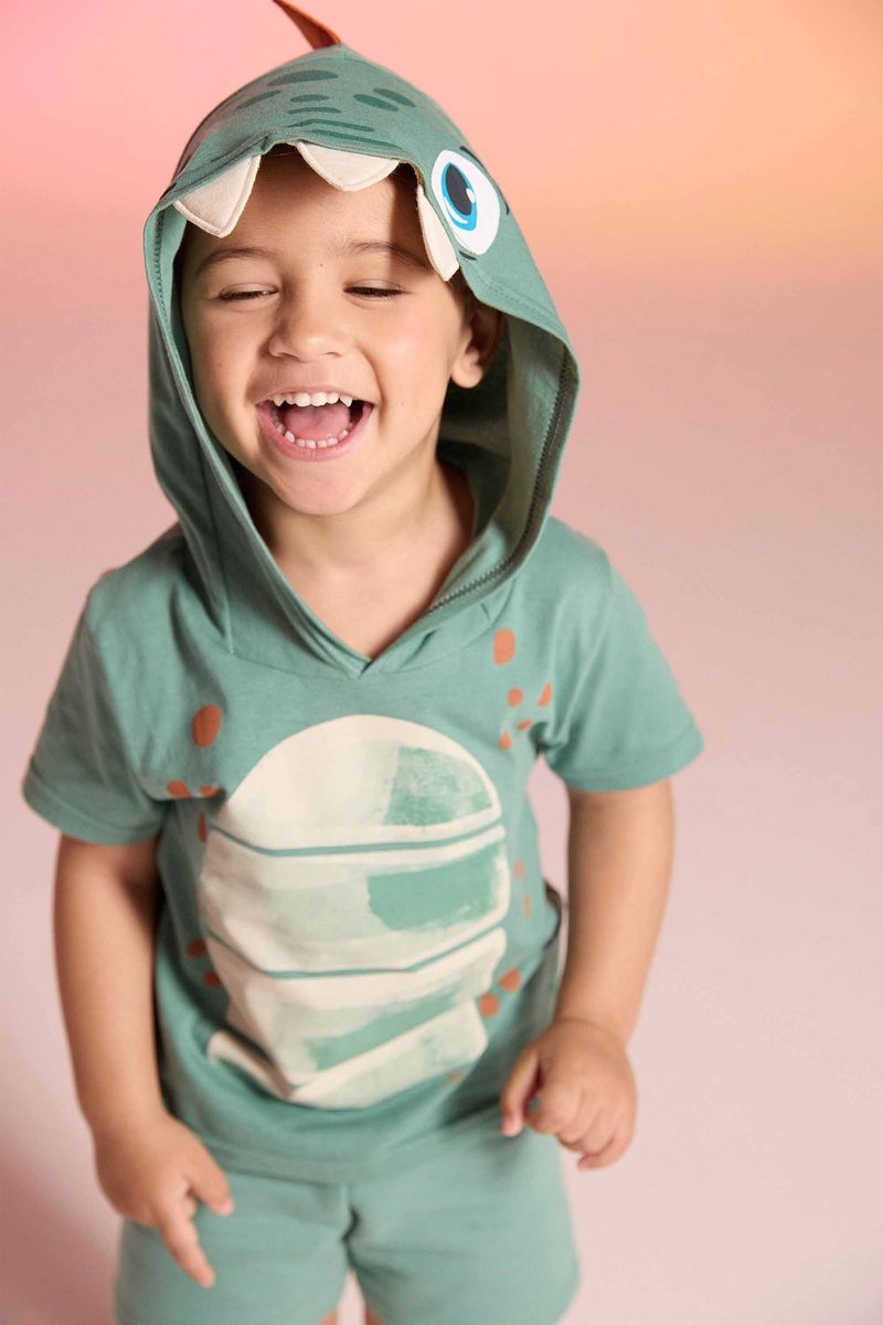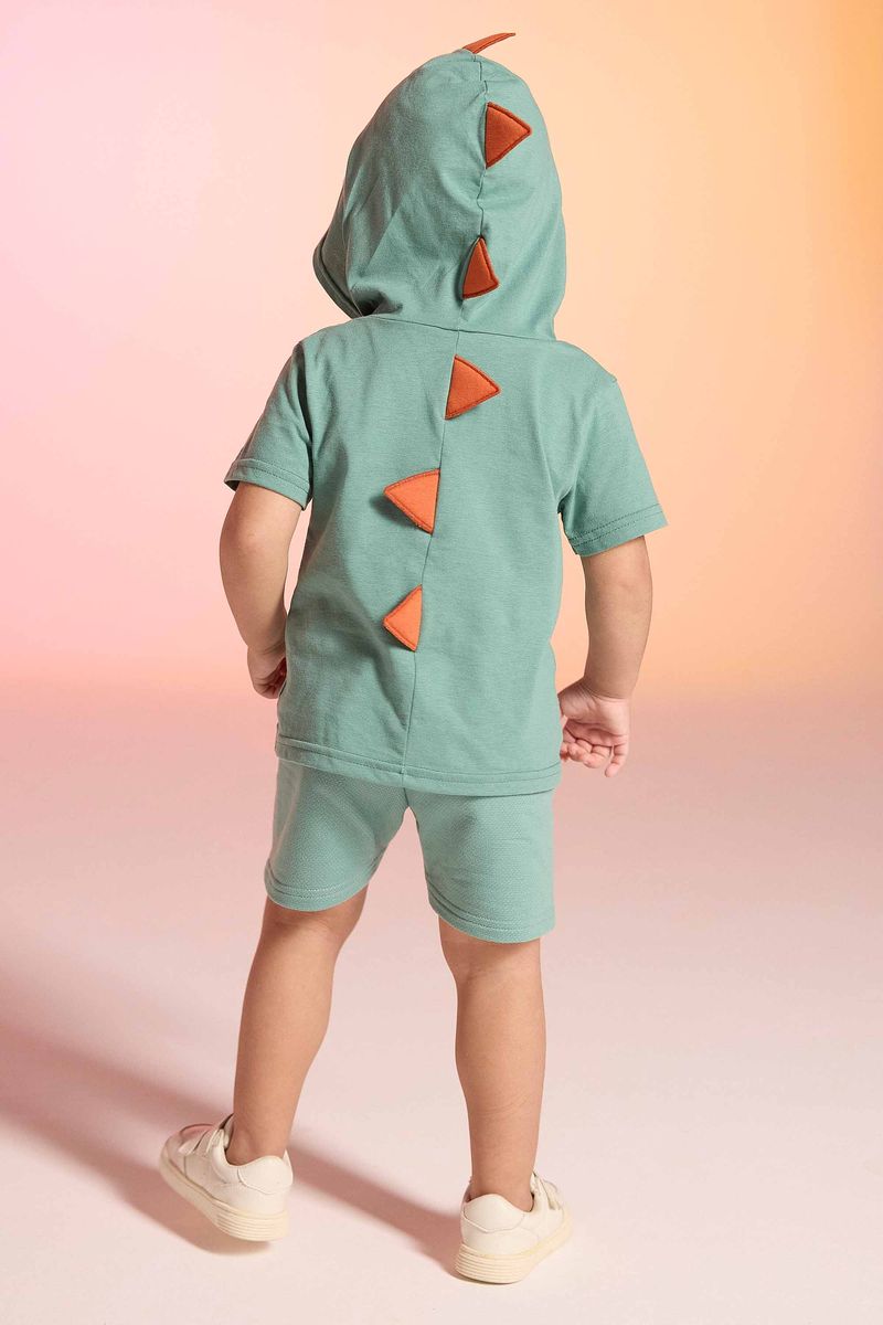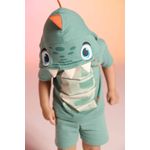 • Conjunto composto por camiseta e bermuda • Feito em meia malha e moletom texturizado • Possui mangas curtas • Possui capuz com aplicações • Possui estampa imitando um dinossauro • Possui elástico no cós • Ideal para brincadeiras e festas a fantasia