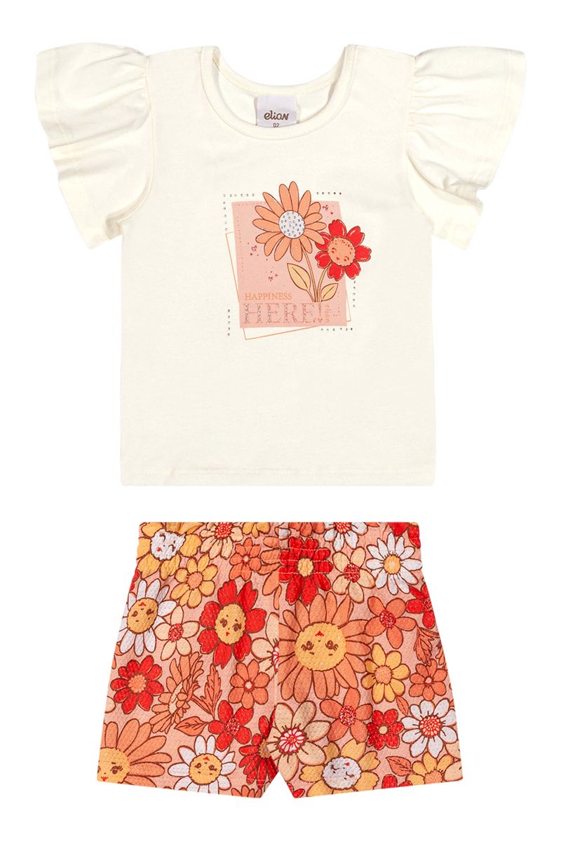 Conjunto Infantil Menina Manga Curta Flores Elian Bege REF: 232170-2037