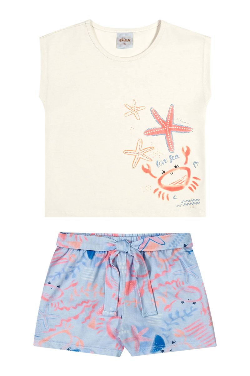 • Conjunto composto por blusa e short • Feito em meia malha • Ombros muscle tee trazem um toque moderno • Estampa de caranguejo com detalhes em glitter • Elástico no cós com tira embutida para amarração • Ideal para dias de sol