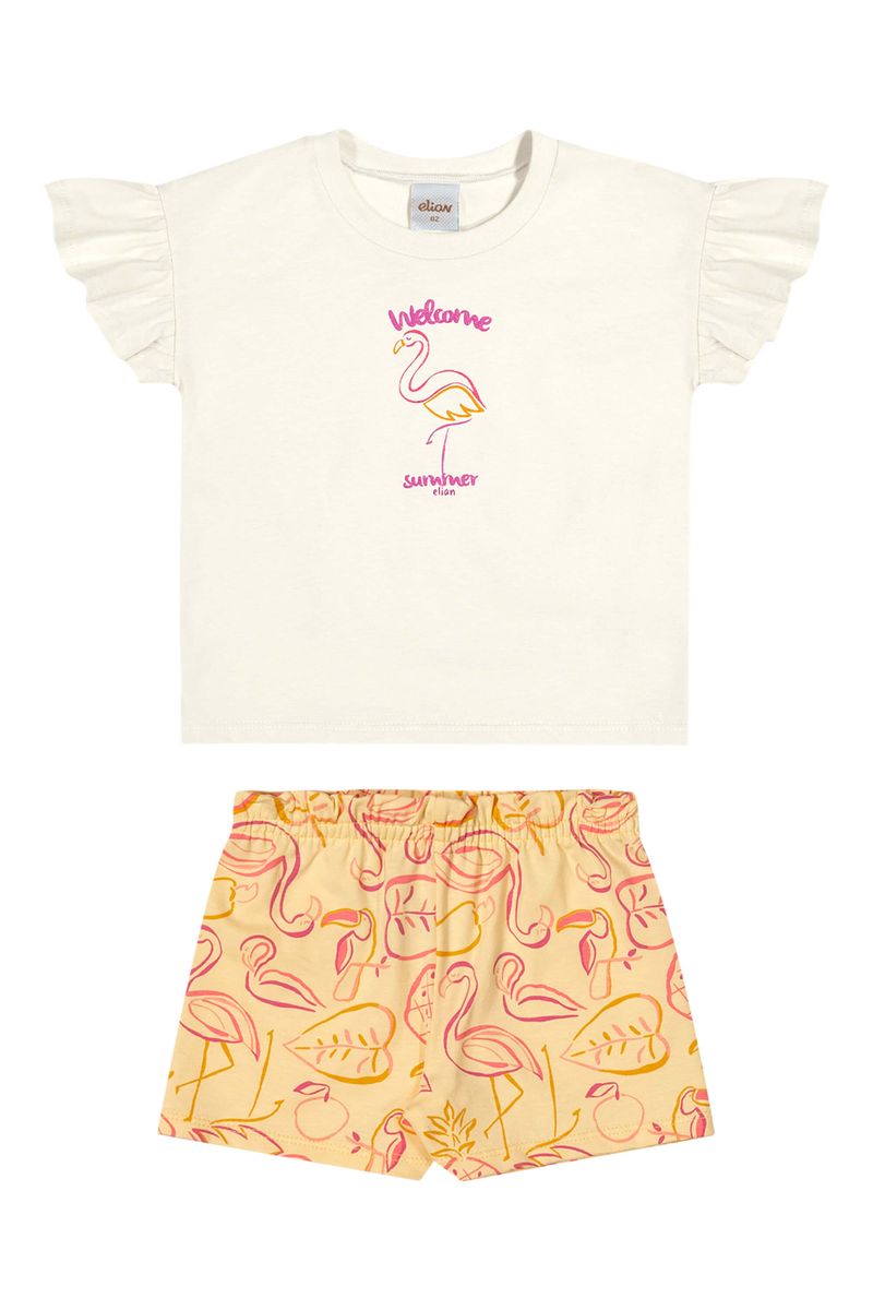 • Conjunto composto por blusa e short • Feito em meia malha e cotton leve • Manga curtas com babados franzidos • Estampa com desenhos tropicais • Detalhes em glitter e puff • Elástico no cós • Ideal para dias ensolarados