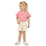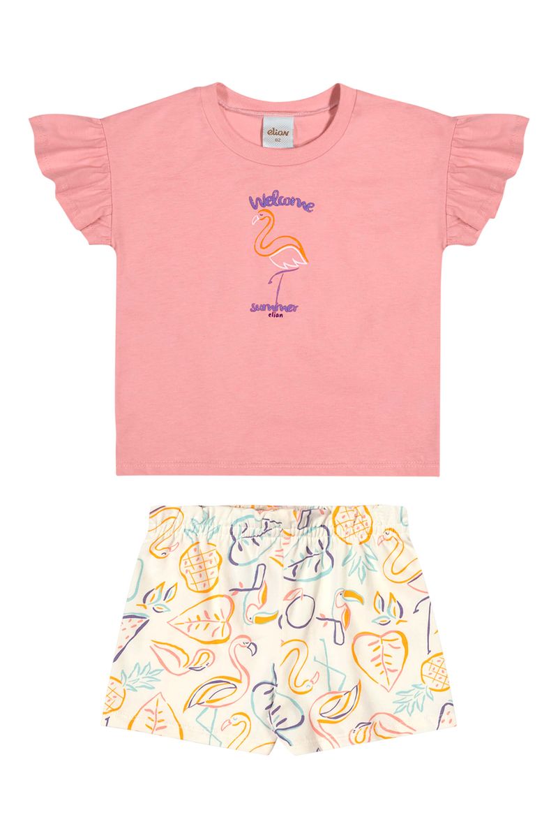 • Conjunto composto por blusa e short • Feito em meia malha e cotton leve • Manga curtas com babados franzidos • Estampa com desenhos tropicais • Detalhes em glitter e puff • Elástico no cós • Ideal para dias ensolarados