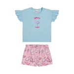 • Conjunto composto por blusa e short • Feito em meia malha e cotton leve • Manga curtas com babados franzidos • Estampa com desenhos tropicais • Detalhes em glitter e puff • Elástico no cós • Ideal para dias ensolarados