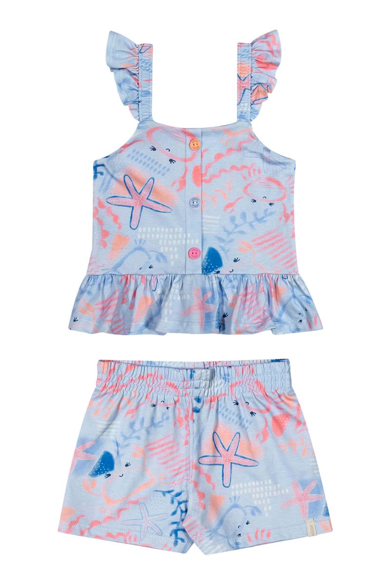 • Conjunto composto por regata e short • Feito em meia malha • Alças com babados • Estampa de caranguejo e elementos do fundo do mar • Elástico no cós • Ideal para momentos de lazer