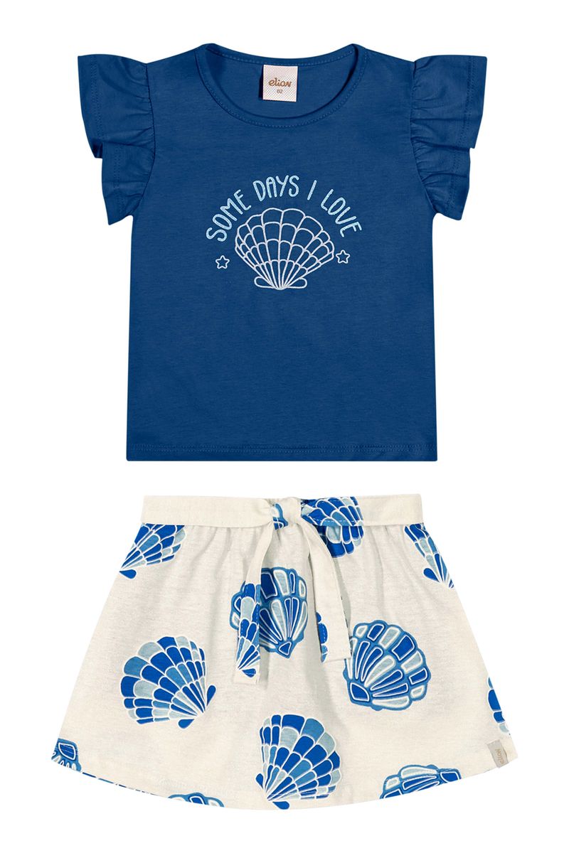 • Conjunto composto por blusa e saia • Feito em meia malha • Mangas curtas com babados • Estampa de conchinhas com efeito perolado • Detalhes em puff e com brilho • Elástico no cós com detalhe para amarração • Possui short interno • Ideal para momentos de lazer e passeios em família