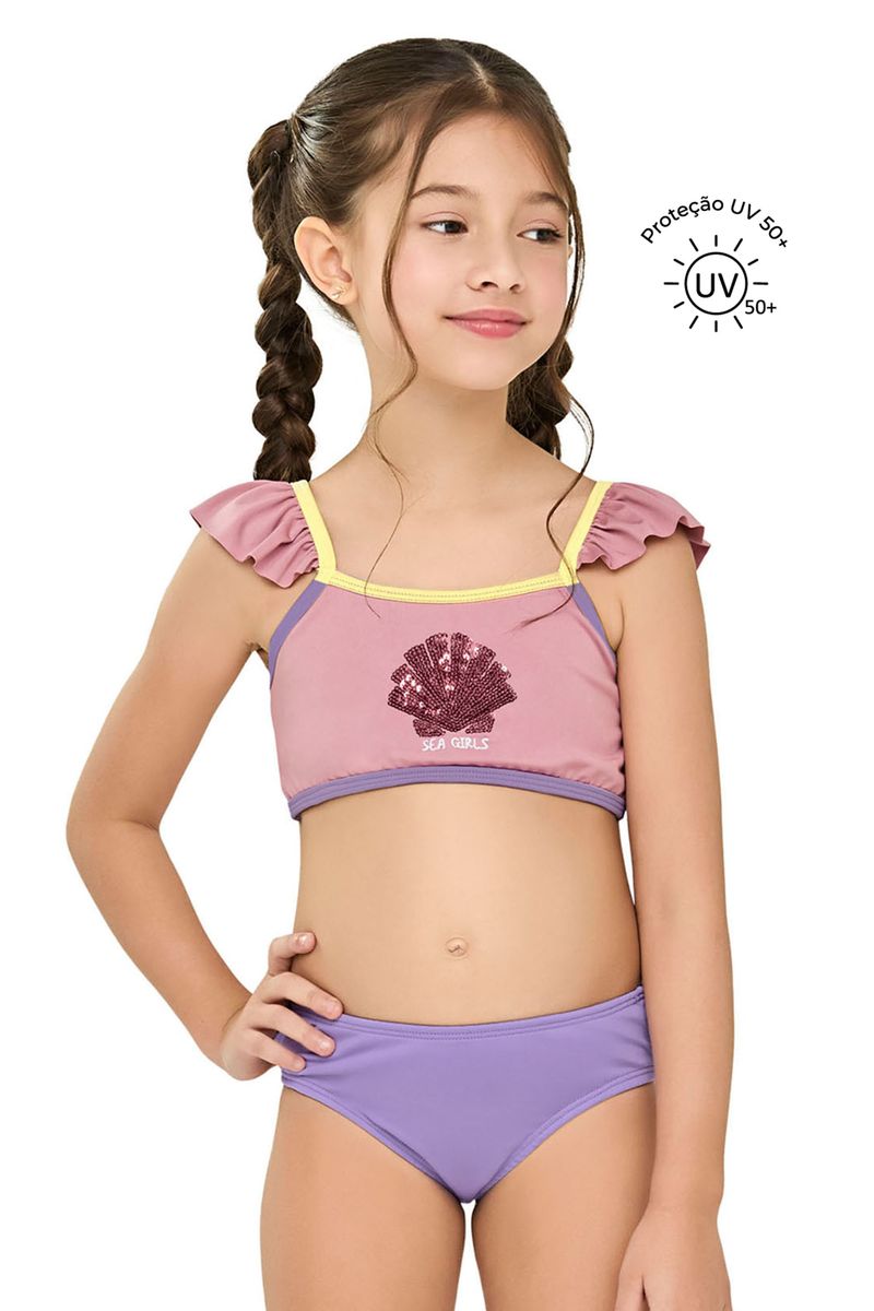 • Feito em malha com proteção UV +50 • Possui alças com babados • Bordado de concha com lantejoulas • Elástico na cintura e na boca das penas • Possui forro interno • Ideal para dias de brincadeiras na água