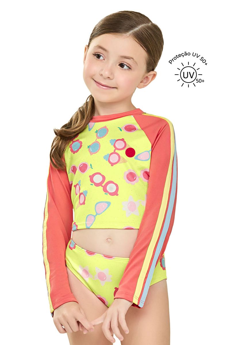 • Conjunto de Praia composto por top e calcinha • Feito em malha de proteção UV +50 • Mangas longas com tiras contrastantes • Estampa lúdica • Etiqueta emborrachada • Elástico no cós • Possui forro interno • Ideal para momentos de diversão na água