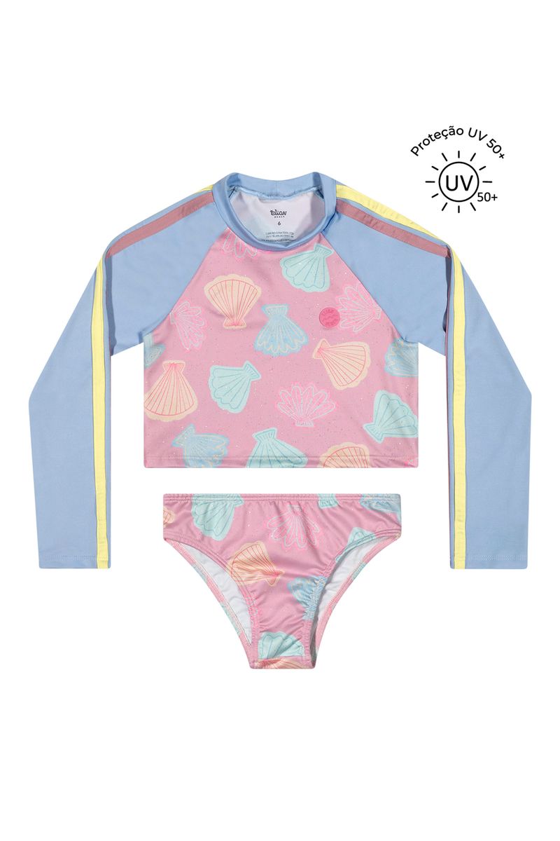 • Conjunto de Praia composto por top e calcinha • Feito em malha de proteção UV +50 • Mangas longas com tiras contrastantes • Estampa lúdica • Etiqueta emborrachada • Elástico no cós • Possui forro interno • Ideal para momentos de diversão na água