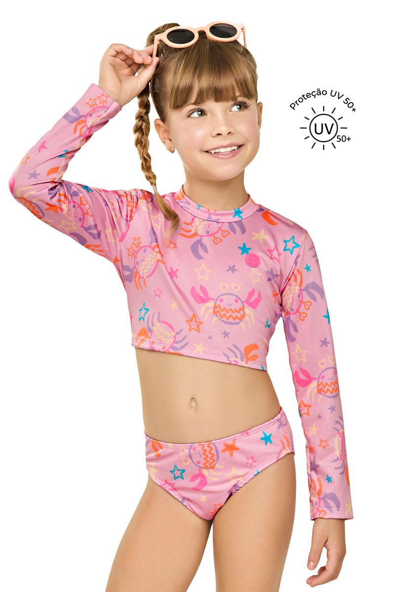 • Conjunto de Praia composto por top e calcinha • Feito em malha de proteção UV +50 • Mangas longas • Estampa de animais marinhos • Etiqueta emborrachada • Elástico no cós • Possui forro interno • Ideal para momentos de diversão na água
