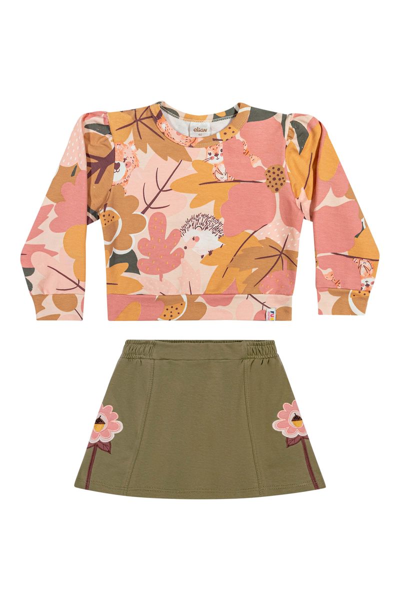 • Conjunto composto por blusão e saia • Feita em molecotton felpado • Possui mangas longas com franzidos nos ombros • Possui estampa floral e detalhe em bordado • Possui elástico no cós • Possui short interno • Ideal para passeios e momentos especiais