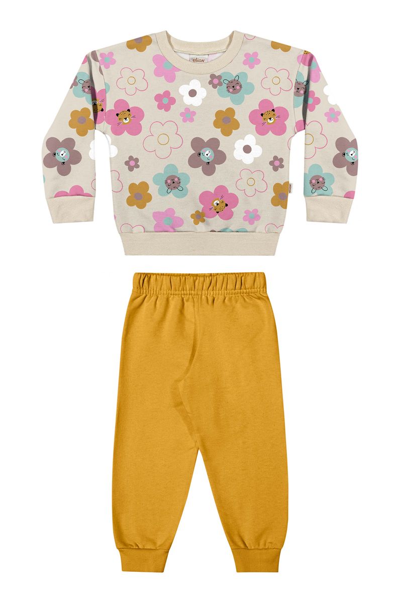• Conjunto composto por blusão e calça • Feito em moletom felpado • Possui mangas longas • Estampa floral com rosto de bichinhos • Elástico no cós • Ideal para passeios e momentos de diversão