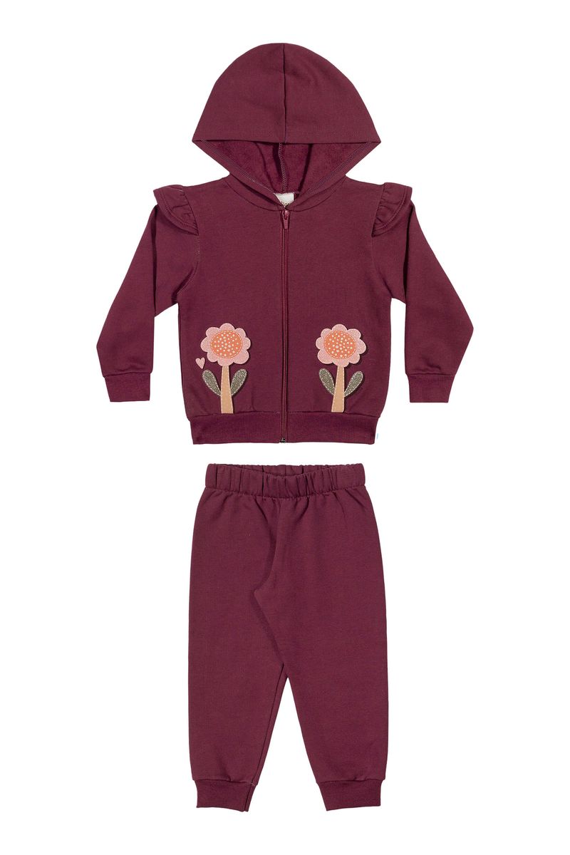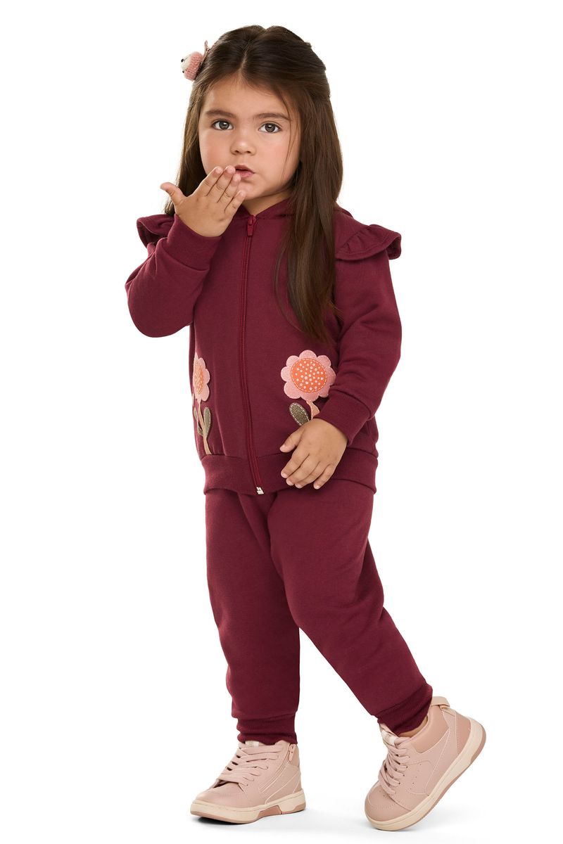 • Conjunto composto por jaqueta e calça • Feito em moletom felpado • Possui mangas longas com babados nos ombros • Possui capuz • Possui abertura frontal em zíper • Possui estampa floral com glitter • Possui elástico no cós • Ideal para momentos divertidos e passeios