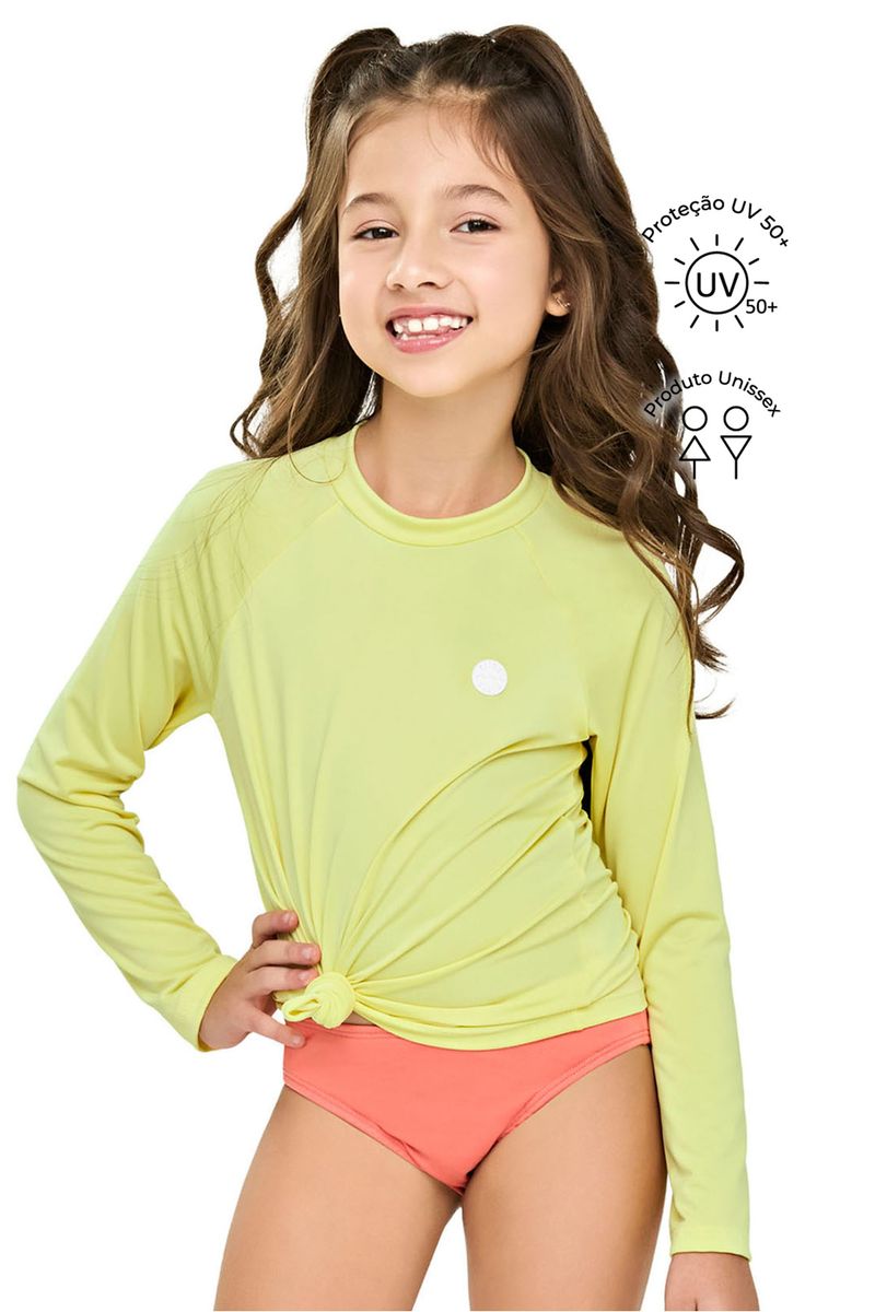 • Feito em malha de proteção UV +50 • Mangas longas raglan • Etiqueta emborrachada • Ideal para a praia, piscina e atividades diversas