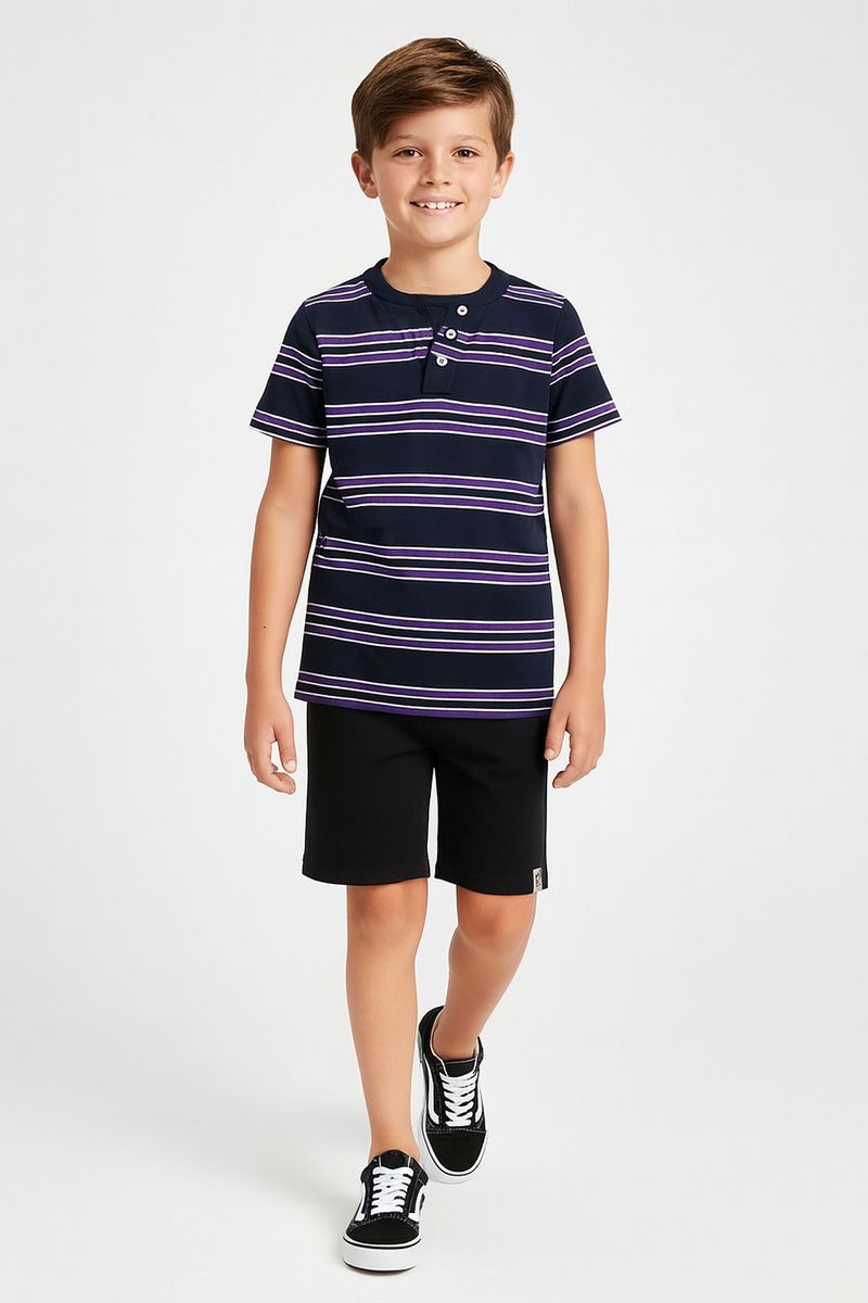 • Feita em meia malha • Possui mangas curtas • Possui estampa listrada • Possui recorte em V no peitilho com botões decorativos • Ideal para passeios e momentos que pedem um look arrumado