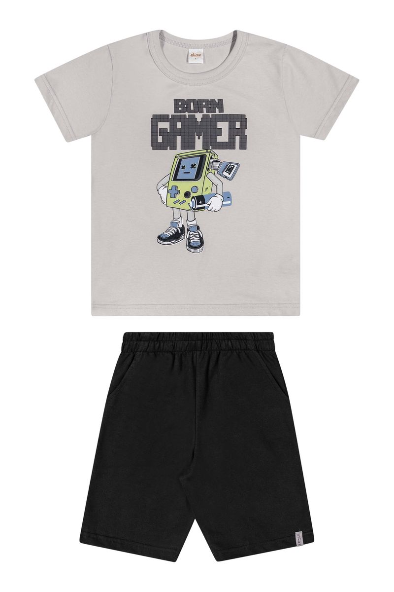 • Conjunto composto por camiseta e bermuda • Feito em meia malha e moletinho • Estampa com temática gamer • Detalhes em puff • Elástico no cós • Possui bolsos laterais • Ideal para momentos de lazer e passeios