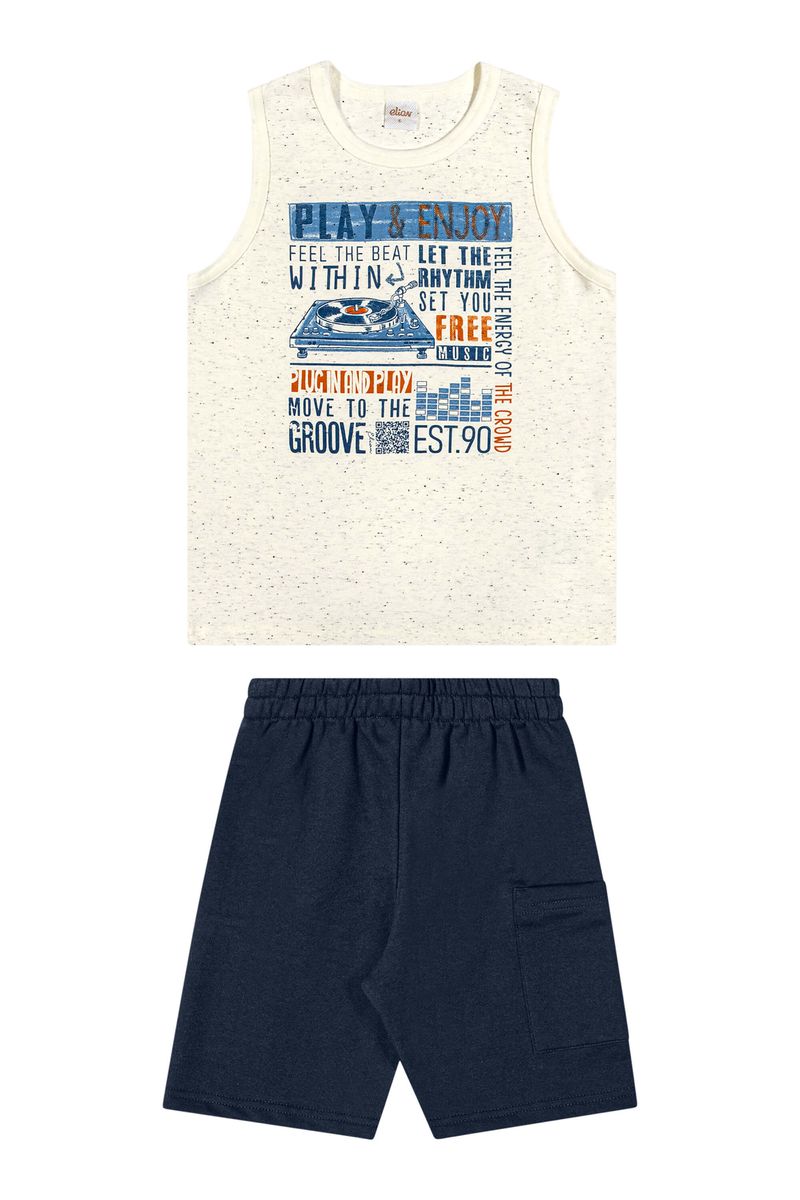 • Conjunto composto por regata e bermuda • Feito em malha botonê e moletinho • Estampa com temática musical • Elástico no cós • Possui bolso lateral • Ideal para momentos descontraídos