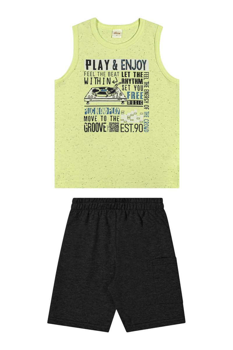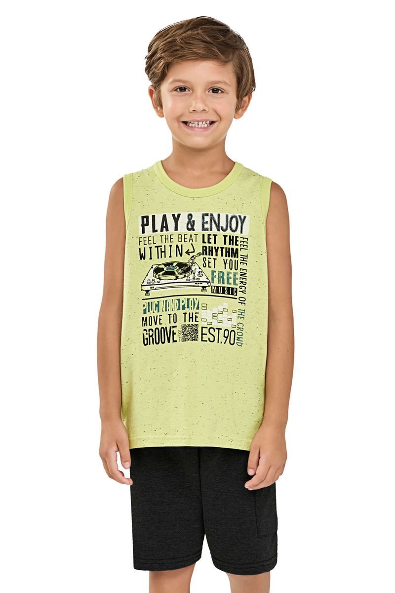 • Conjunto composto por regata e bermuda • Feito em malha botonê e moletinho • Estampa com temática musical • Elástico no cós • Possui bolso lateral • Ideal para momentos descontraídos