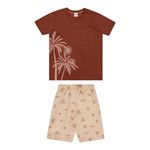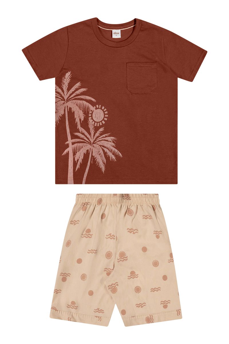 • Conjunto composto por camiseta e bermuda • Feito em meia malha e tecido tricoline com elastano • Estampa tropical com elementos de verão • Elástico no cós • Ideal para momentos especiais e passeios em família