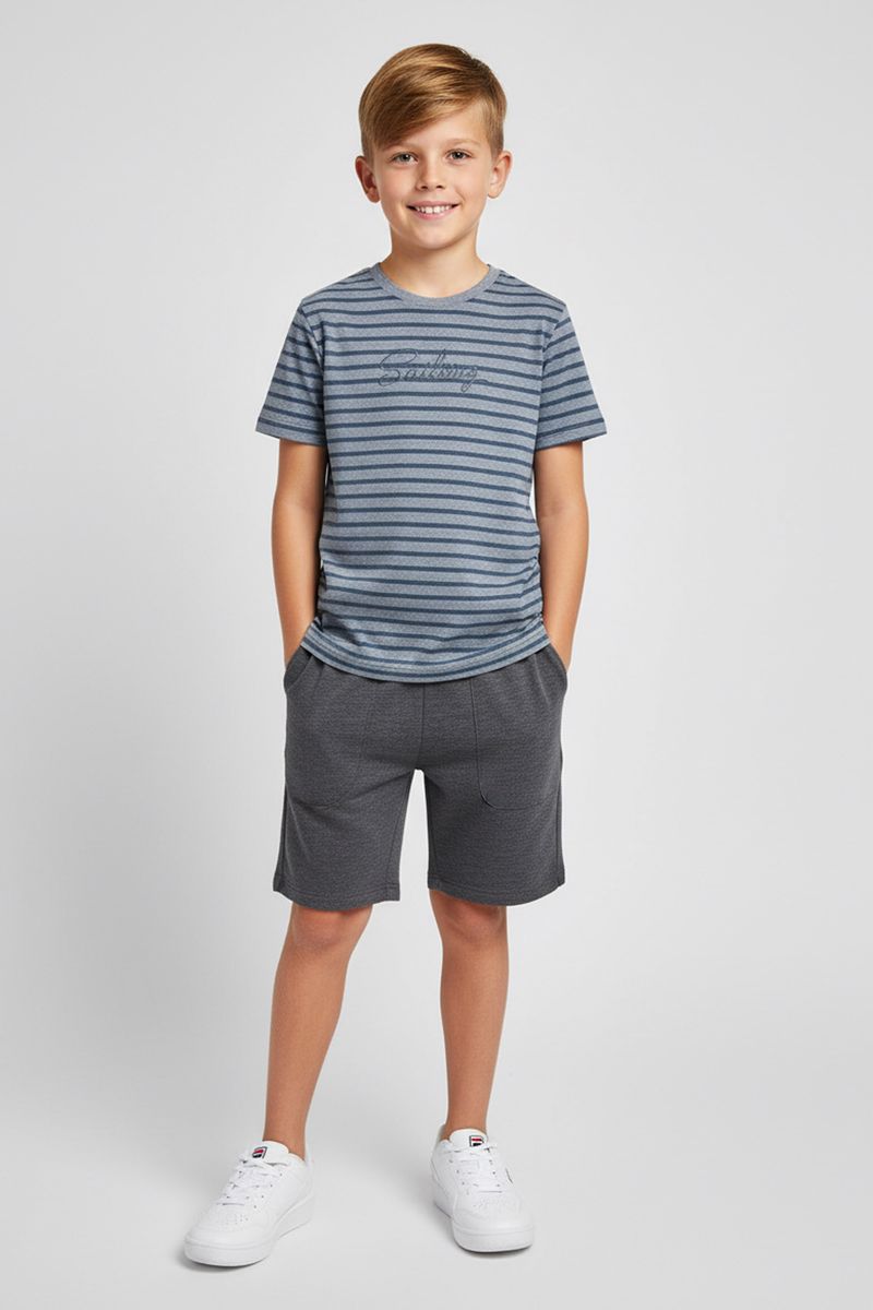 • Conjunto composto por camiseta e bermuda • Feito em piquet barton e malha dublada • Possui mangas curtas • Possui estampa listrada com bordado frontal • Possui elástico no cós • Possui bolsos laterais • Ideal para passeios e momentos de lazer