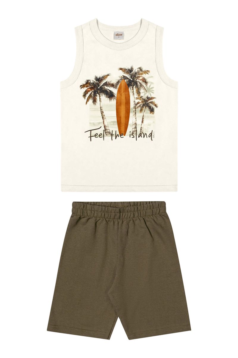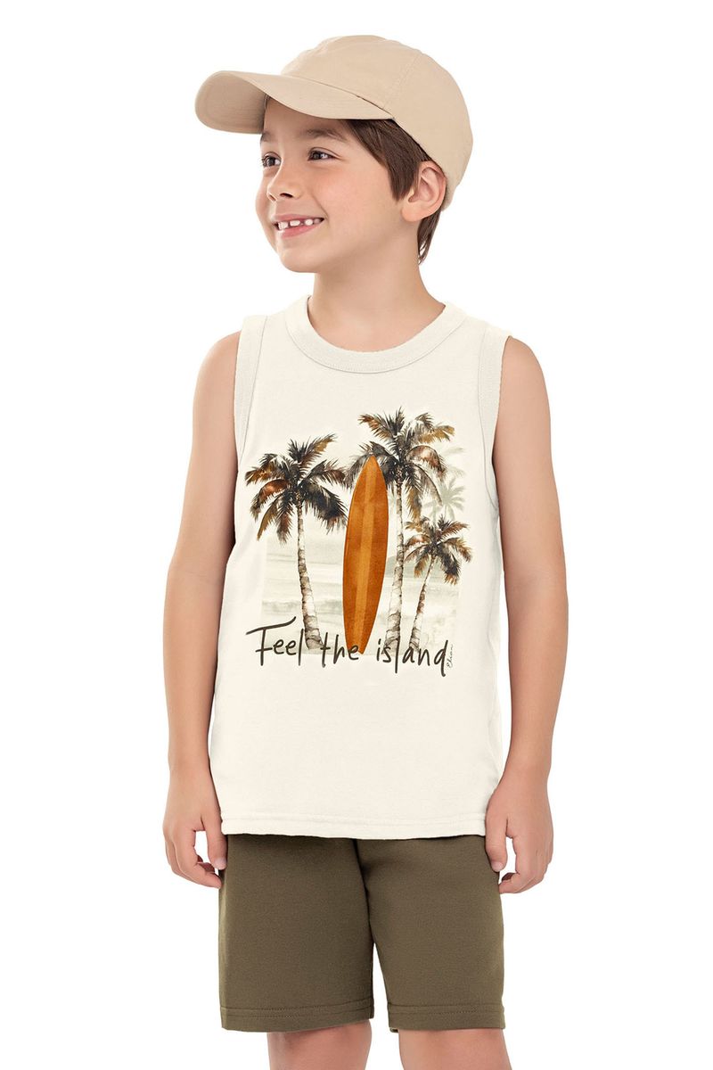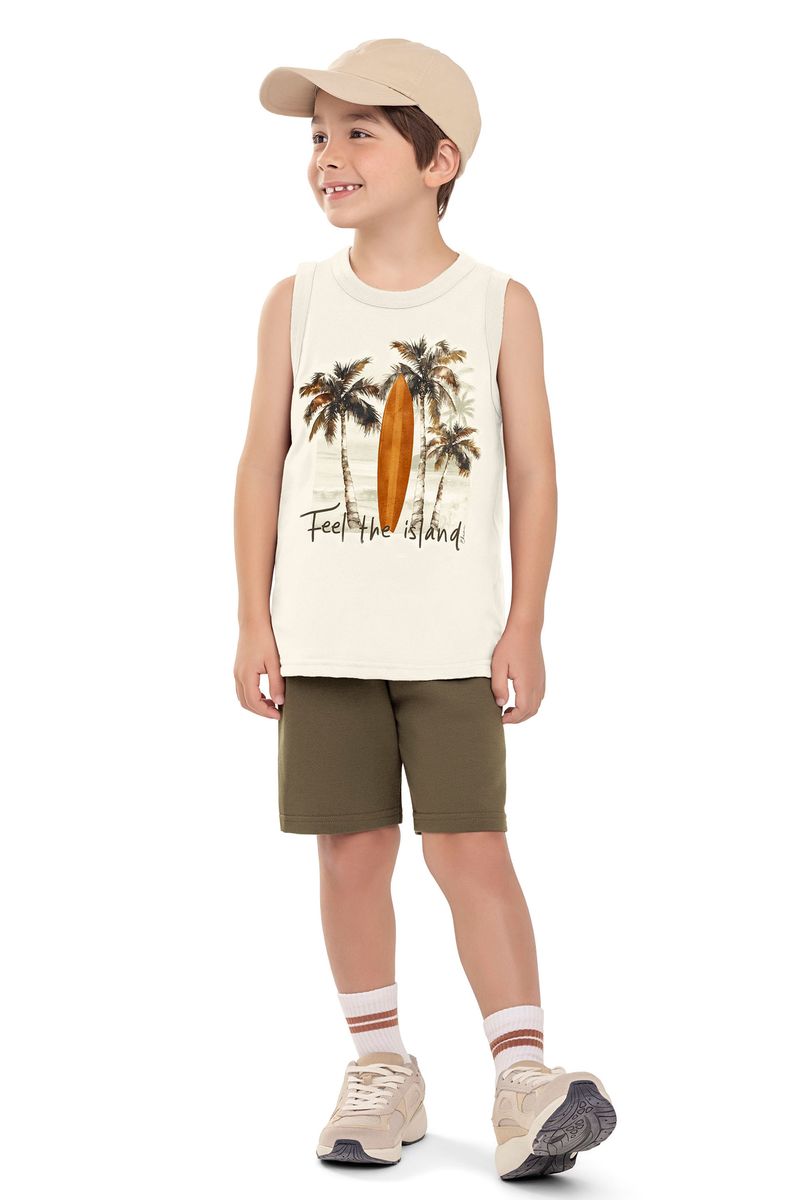 • Conjunto composto por regata e bermuda • Feito em meia malha e moletom sem felpa • Possui estampa frontal • Possui elástico no cós • Ideal para passeios e momentos de lazer
