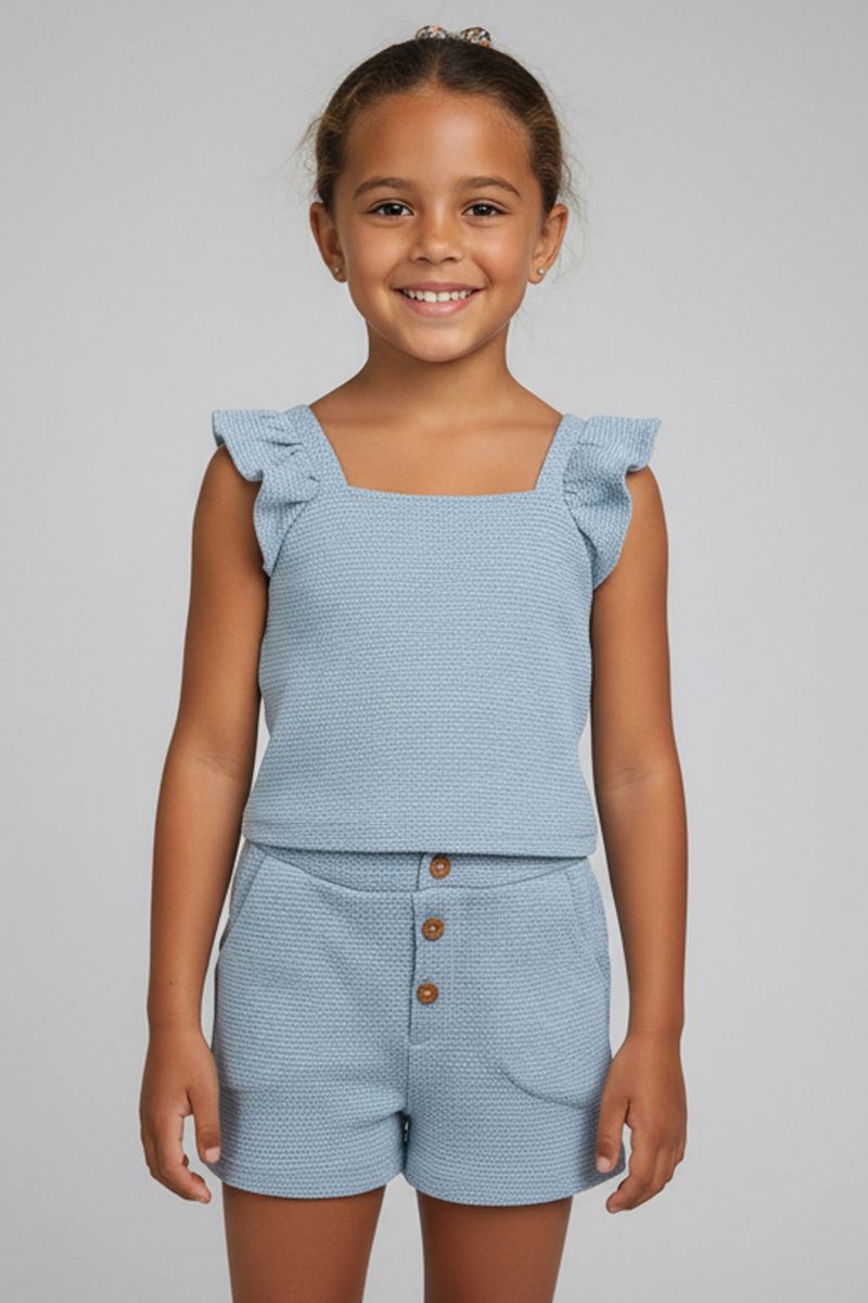• Conjunto composto por regata e short • Feito em new croche gloss • Possui alças com babados • Possui elástico no cós • Possui forro • Possui bolsos • Ideal para passeios e momentos especiais