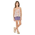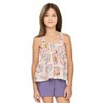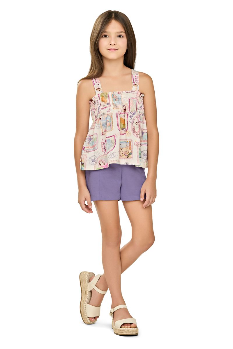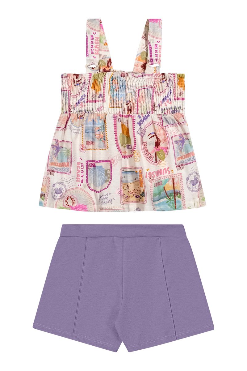 • Conjunto composto por regata e short • Feito em meia malha e moletinho dublado • Possui busto em lastex • Estampa inspirada em selos postais • Elástico no cós • Ideal para momentos de lazer e passeios