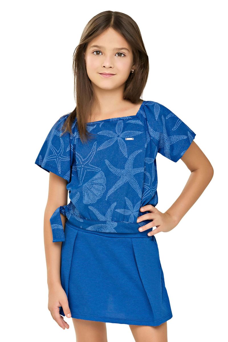 • Conjunto composto por blusa e short saia • Feito em meia malha e malha trabalhada • Estampa com estrelas-do-mar e conchas • Mangas curtas amplas • Com detalhe em amarração • Elástico no cós • Ideal para passeios e dias do sol