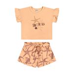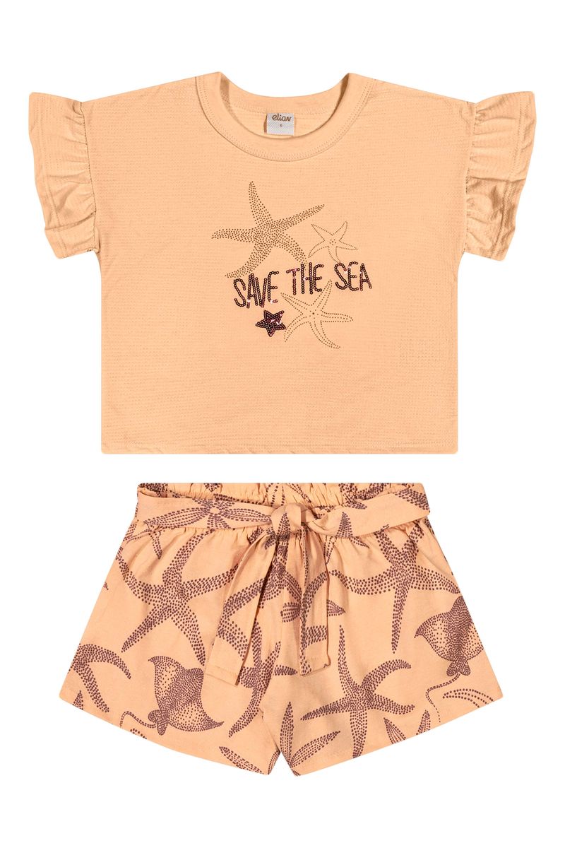 • Conjunto composto por blusa e short • Feito em malha trabalhada e meia malha • Estampa com estrelas-do-mar e bordado com lantejoula • Mangas curtas amplas • Elástico no cós • Com detalhe em amarração • Ideal para passeios