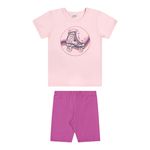 • Conjunto composto por blusa e ciclista • Feito em meia malha e cotton leve • Estampa de patins com efeito puff e brilhos • Elástico no cós • Ideal para momentos de diversão