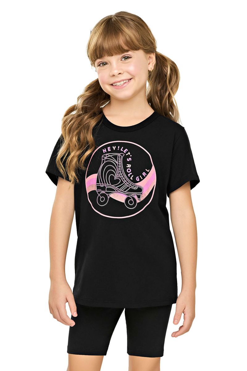 • Conjunto composto por blusa e ciclista • Feito em meia malha e cotton leve • Estampa de patins com efeito puff e brilhos • Elástico no cós • Ideal para momentos de diversão