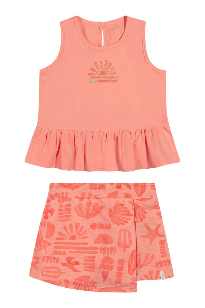 • Conjunto composto por regata e short saia • Feito em tricoline e malha trabalhada • Estampa com elementos tropicais em efeito carimbo • Regata com fechamento em botão nas costas • Elástico no cós • Ideal para momentos especiais