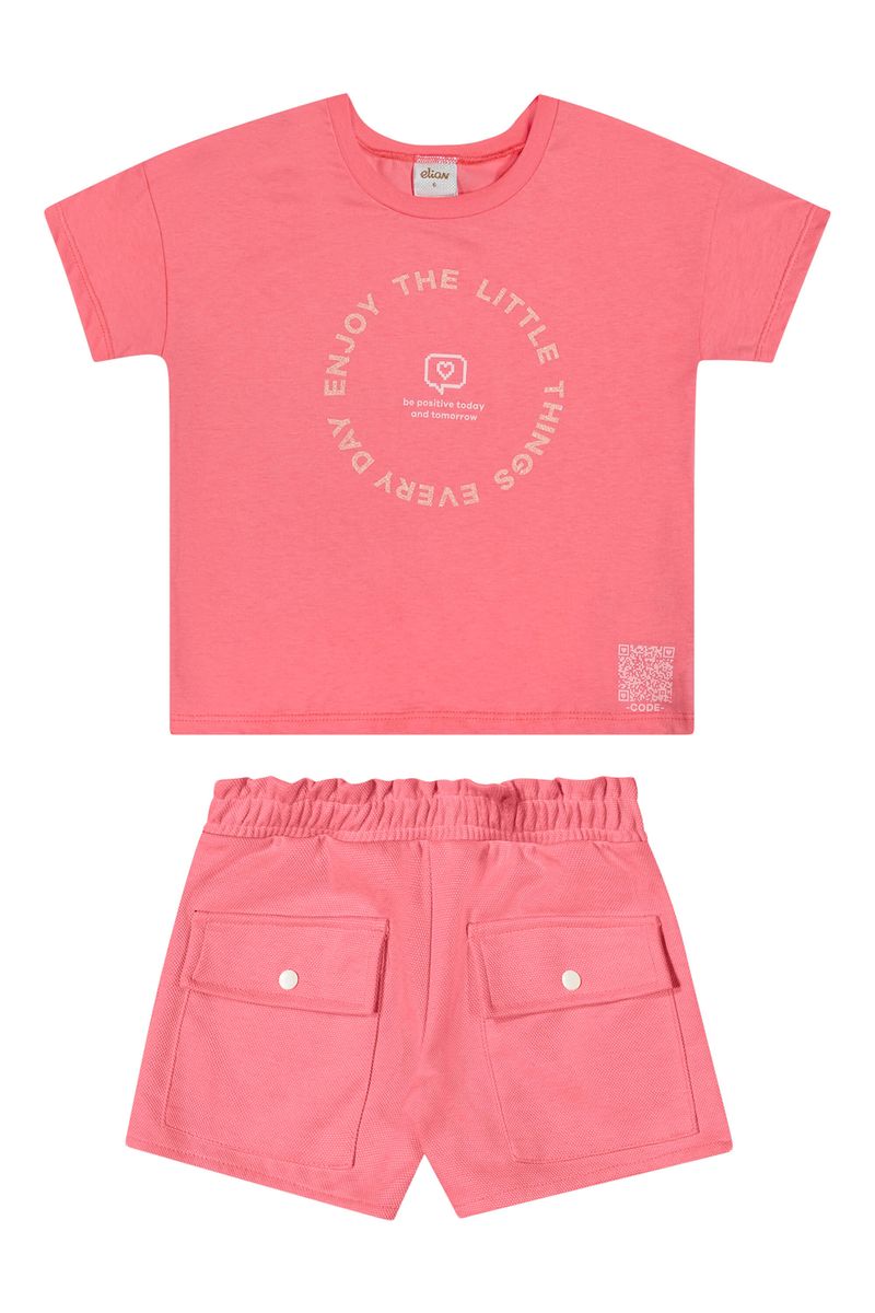 • Conjunto composto por blusa e short • Feito em meia malha e moletinho dublado • Estampa com QR Code interativo com acesso à playlist • Detalhes em puff e brilho • Elástico no cós • Possui bolsos com fechamento em botões de pressão • Ideal para momentos de lazer