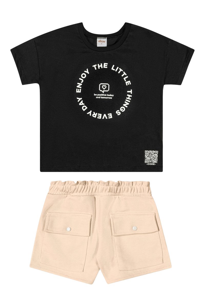 • Conjunto composto por blusa e short • Feito em meia malha e moletinho dublado • Estampa com QR Code interativo com acesso à playlist • Detalhes em puff e brilho • Elástico no cós • Possui bolsos com fechamento em botões de pressão • Ideal para momentos de lazer