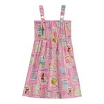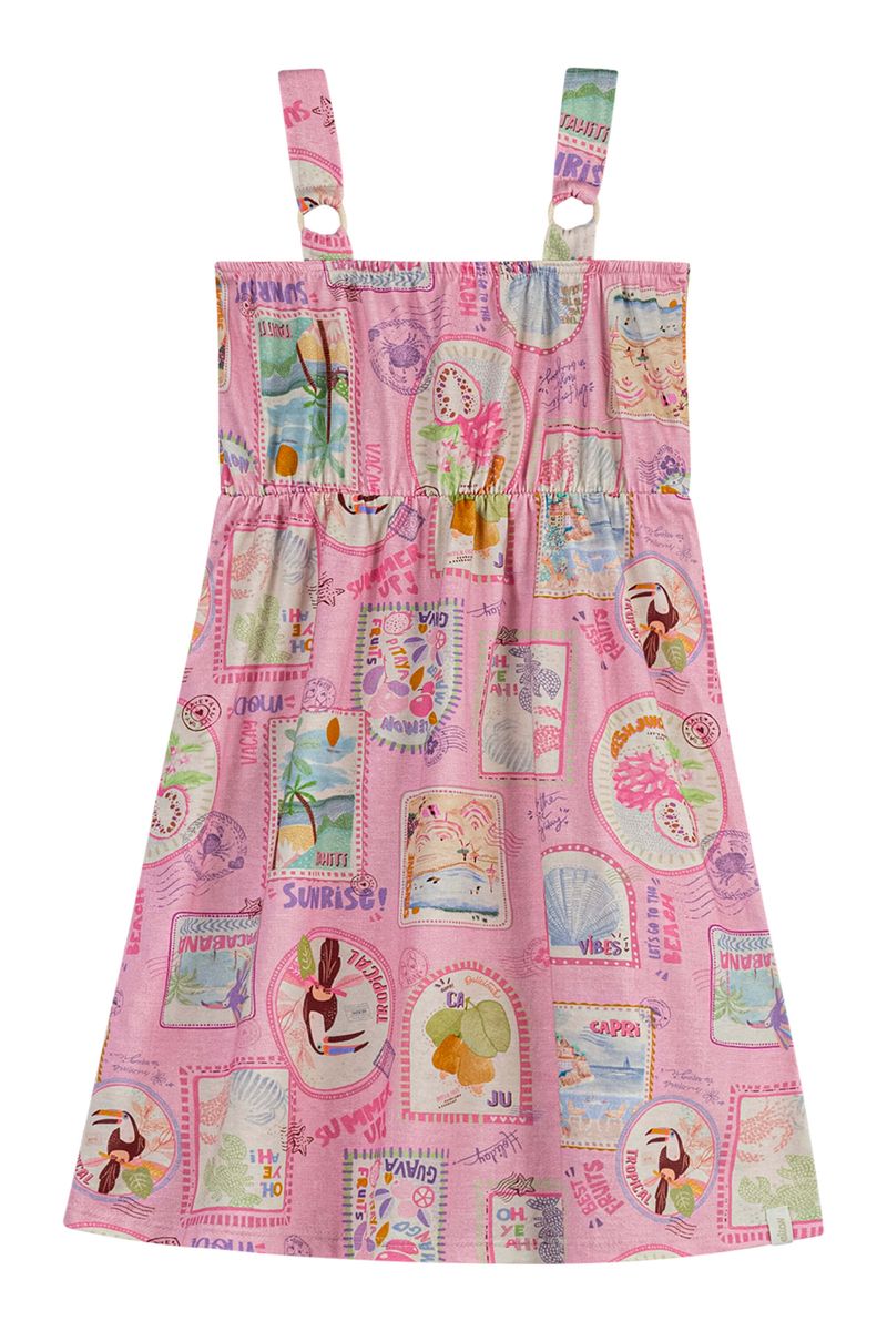 • Feito em meia malha • Estampa inspirada em selos postais • Possui alças com detalhe em argola • Possui elástico na cintura • Ideal para momentos de lazer e passeios