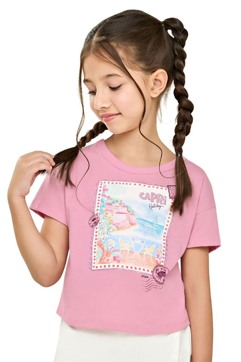 • Feito em meia malha • Estampa inspirada em selos postais com detalhes em brilho • Possui mangas curtas • Ideal para combinar com saias e shorts