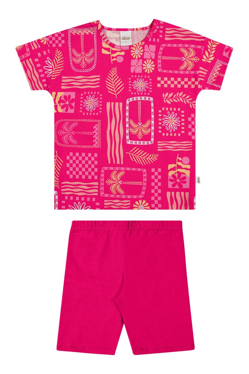 • Conjunto composto por blusa e bermuda ciclista • Feito em meia malha e cotton leve • Estampa de folhagens, flores, coqueiros e formas geométricas • Elástico no cós • Ideal para o dia a dia