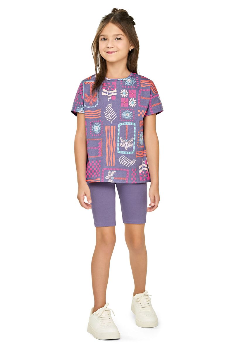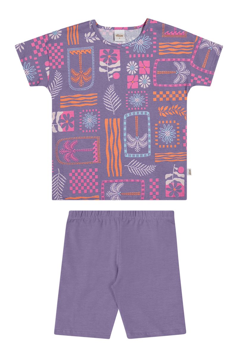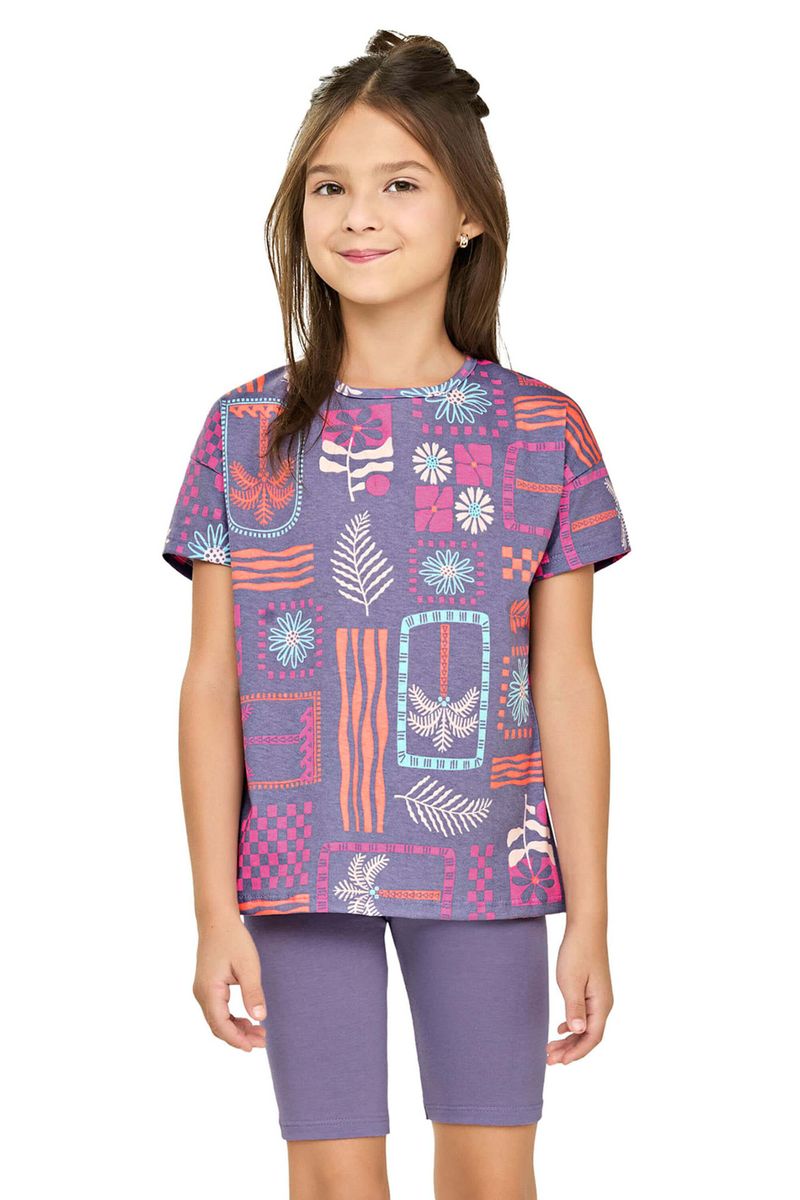• Conjunto composto por blusa e bermuda ciclista • Feito em meia malha e cotton leve • Estampa de folhagens, flores, coqueiros e formas geométricas • Elástico no cós • Ideal para o dia a dia