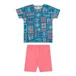 • Conjunto composto por blusa e bermuda ciclista • Feito em meia malha e cotton leve • Estampa de folhagens, flores, coqueiros e formas geométricas • Elástico no cós • Ideal para o dia a dia