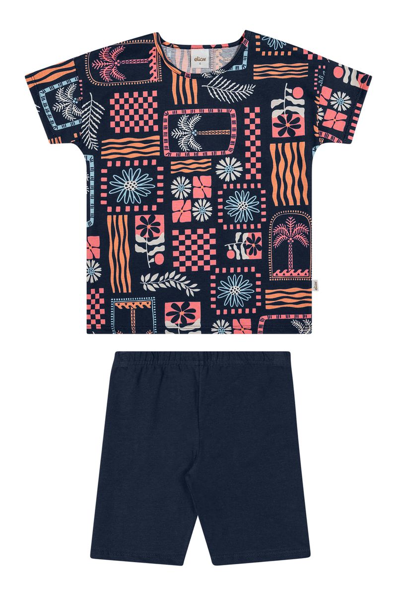 • Conjunto composto por blusa e bermuda ciclista • Feito em meia malha e cotton leve • Estampa de folhagens, flores, coqueiros e formas geométricas • Elástico no cós • Ideal para o dia a dia