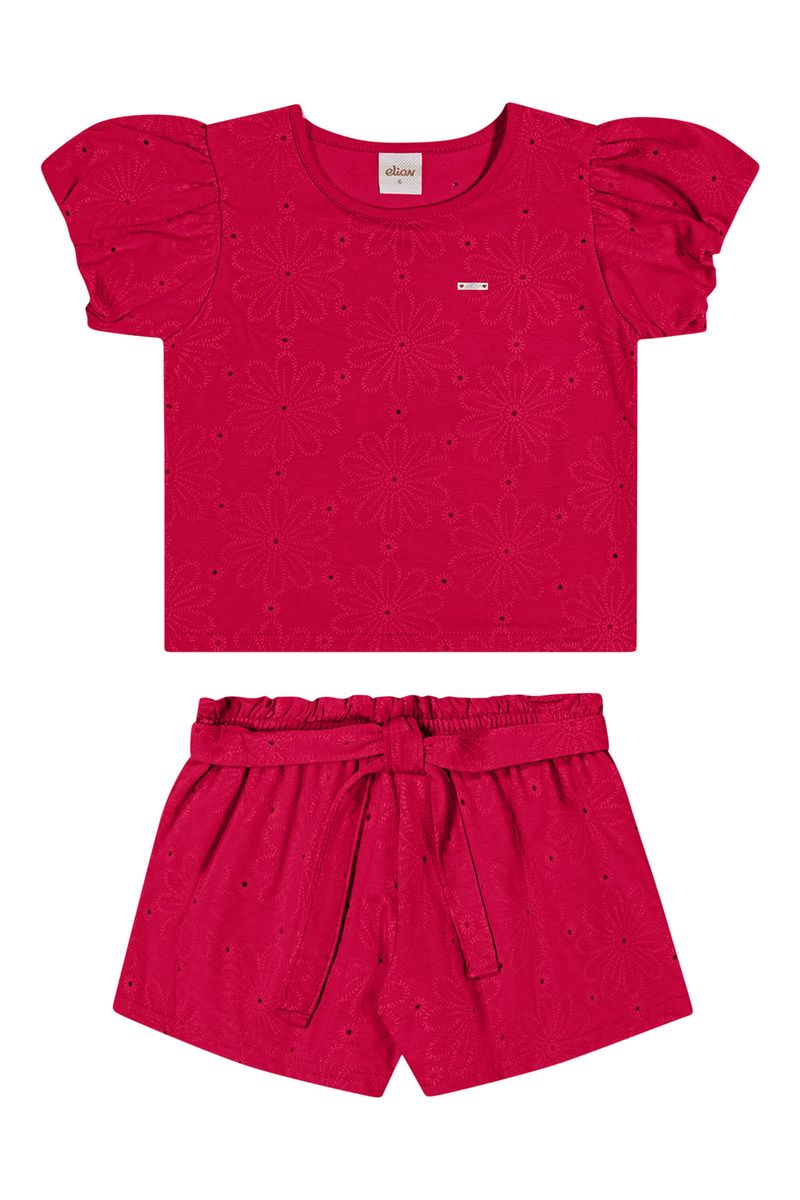 • Conjunto composto por blusa e short • Feito em malha devorê • Mangas curtas balonê • Elástico no cós com detalhe em amarração • Padronagem floral • Possui forro • Ideal para momentos especiais
