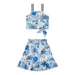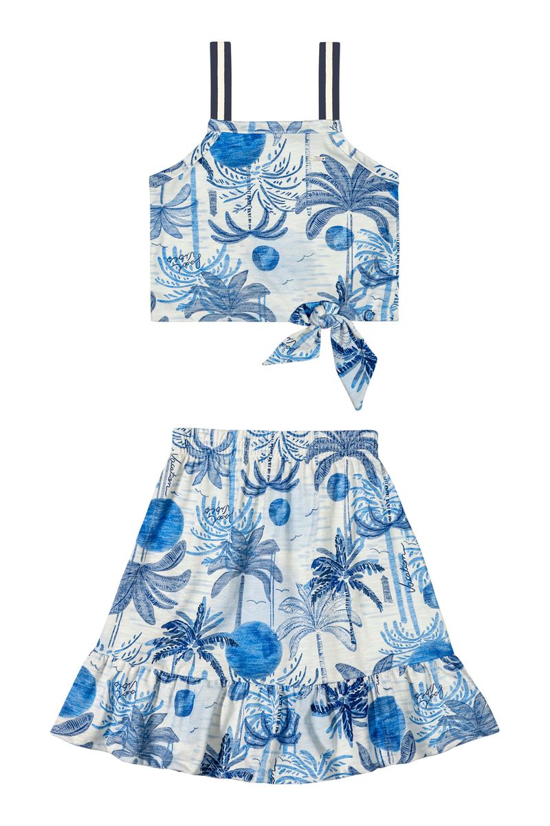 • Conjunto composto por regata e saia • Feito em malha flamê • Possui alças com elástico • Possui estampa tropical • Possui detalhe em amarração • Possui elástico no cós • Ideal para passeios e momentos ao ar livre