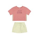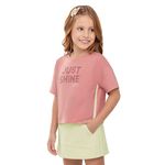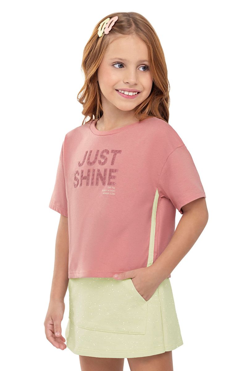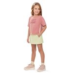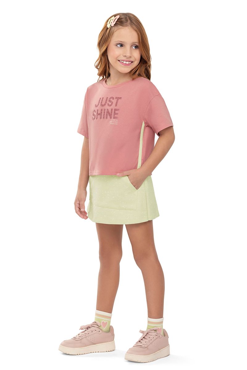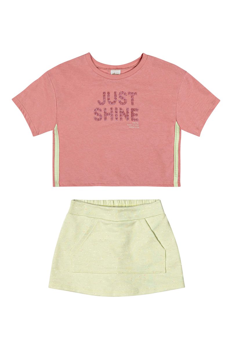 • Conjunto composto por blusa e short saia • Feito em meia malha e moletom botonê • Possui mangas curtas • Possui estampa com puff e brilho • Possui elástico no cós • Possui bolso frontal • Ideal para passeios