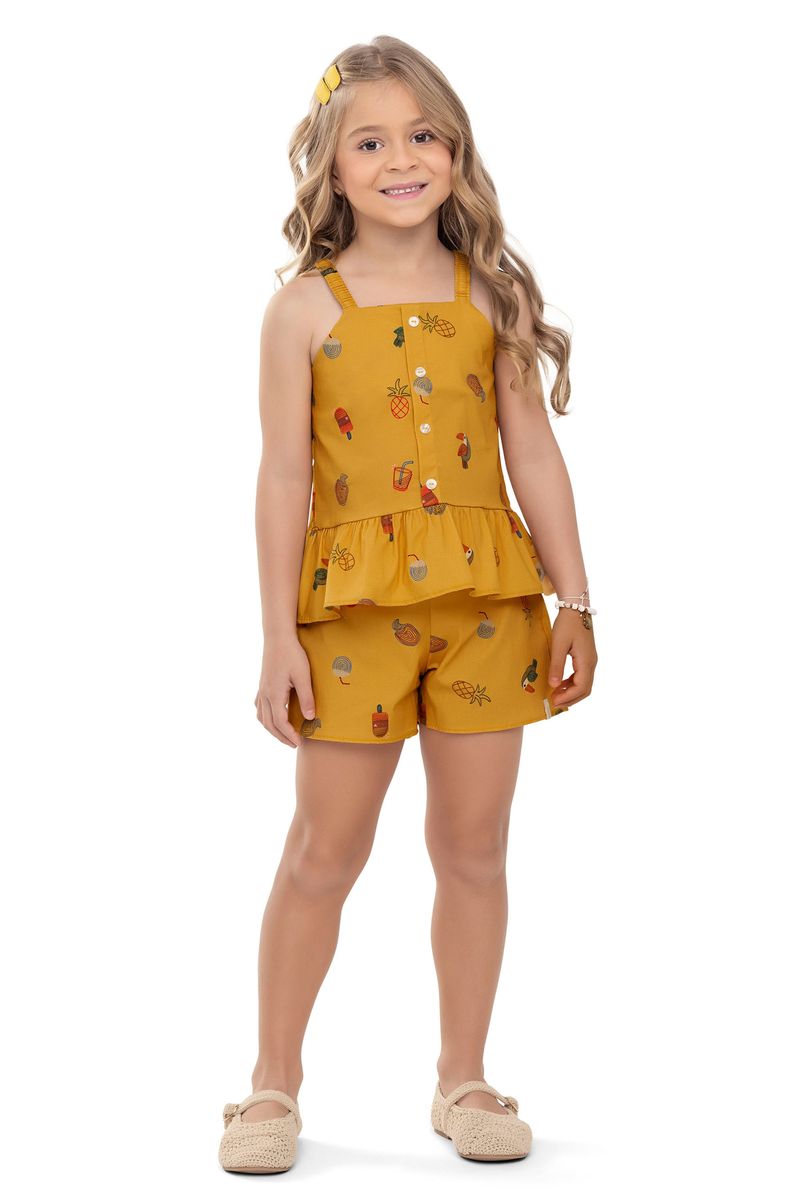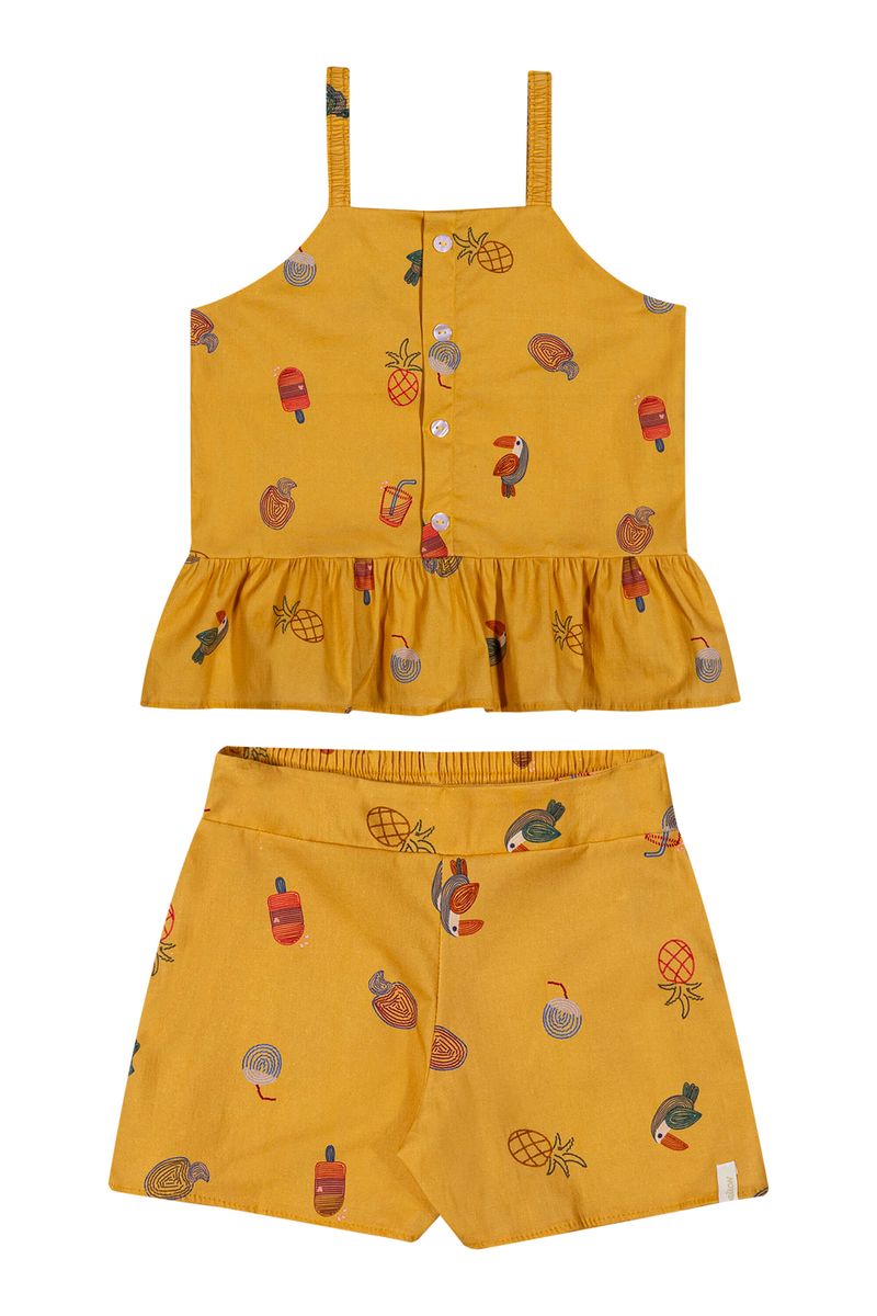 • Conjunto composto por regata e short • Feito em tricoline • Possui alças com elástico • Possui estampa tropical • Possui botões decorativos • Possui babado na barra • Possui elástico no cós • Ideal para passeios e momentos descontraídos