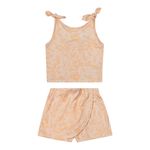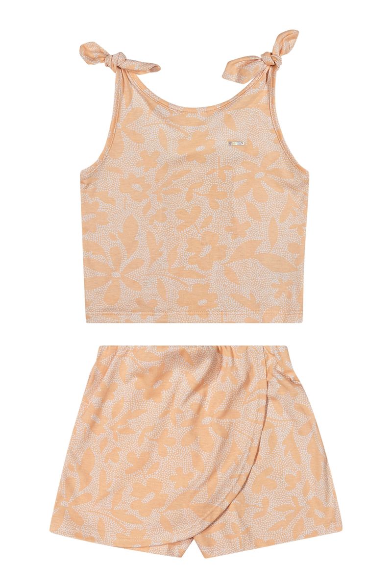 • Conjunto composto por regata e short saia • Feito em meia malha • Possui alças com detalhe em laço • Possui lastex nas costas • Possui estampa floral em pontilhismo • Possui elástico no cós • Ideal para passeios e momentos especiais