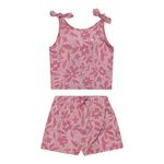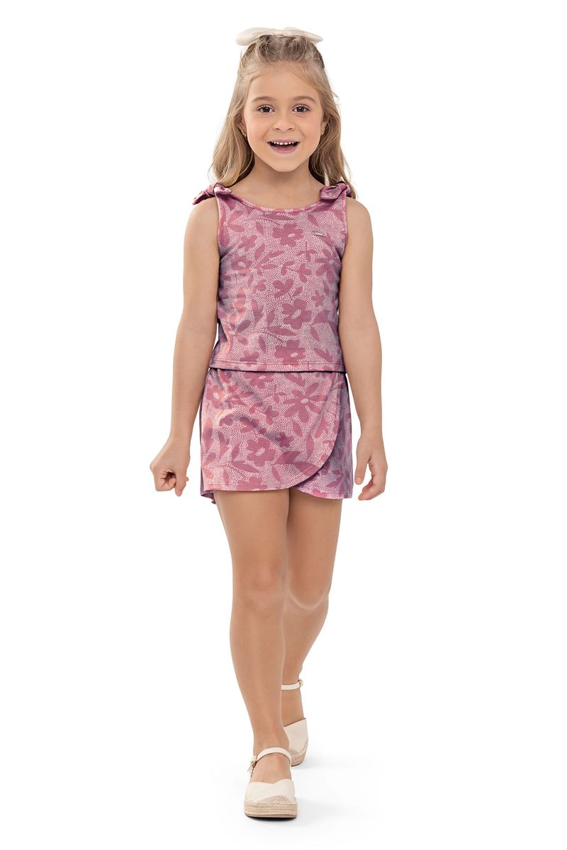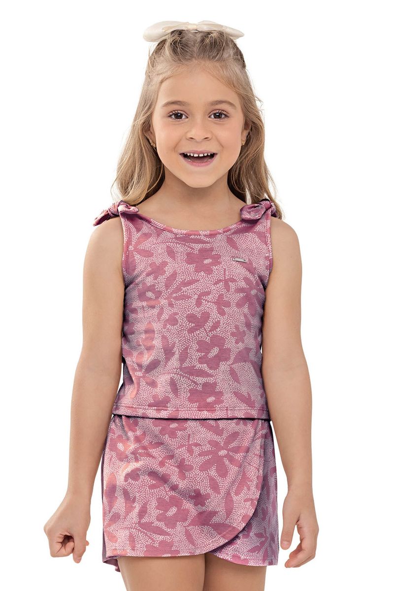• Conjunto composto por regata e short saia • Feito em meia malha • Possui alças com detalhe em laço • Possui lastex nas costas • Possui estampa floral em pontilhismo • Possui elástico no cós • Ideal para passeios e momentos especiais