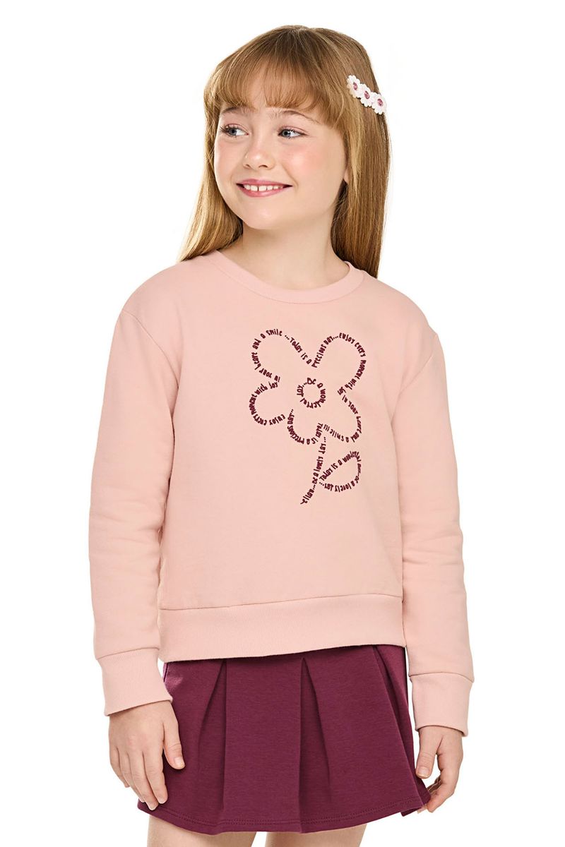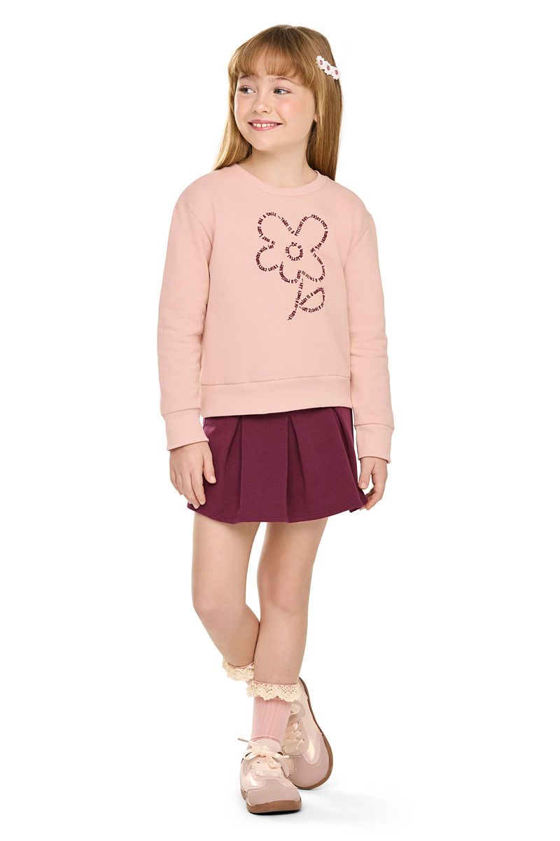 • Conjunto composto por blusão e short saia • Feito em moletom felpado e molecotton felpado • Possui mangas longas • Possui estampa de flor com efeito puff • Possui elástico no cós • Possui detalhes em pregas • Ideal para passeios