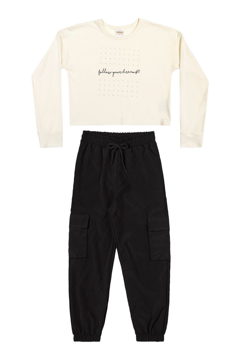 • Conjunto composto por blusa e calça • Feito em cotton leve e tactel com elastano • Possui mangas longas • Possui estampa frontal com strass • Possui elástico no cós e cadarço decorativo • Possui bolsos laterais com lapela • Ideal para momentos de lazer
