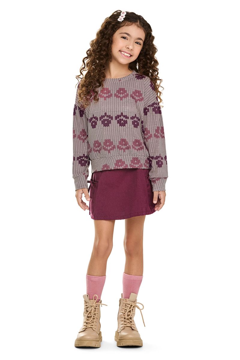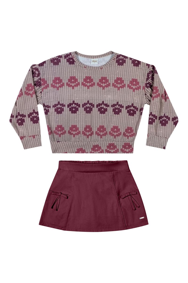 • Conjunto composto por blusa e saia • Feito em cotton leve e sarja • Possui mangas longas com franzidos nos ombros • Possui estampa floral com efeito tricô • Possui elástico no cós • Possui short interno • Possui bolsos laterais e detalhes em laços • Ideal para momentos especiais